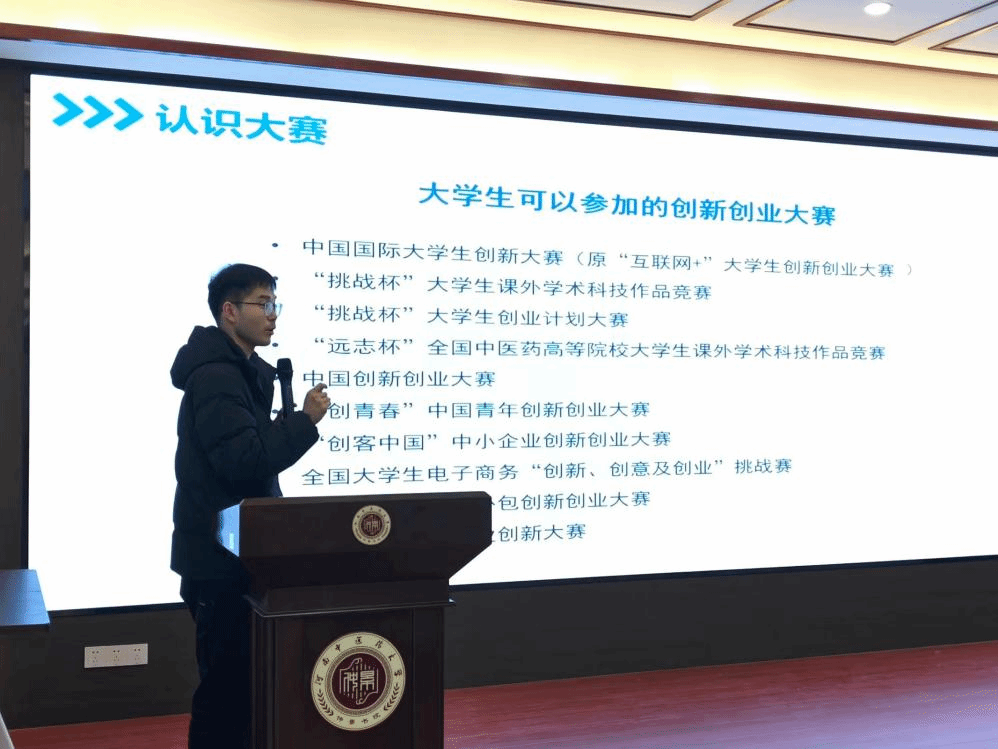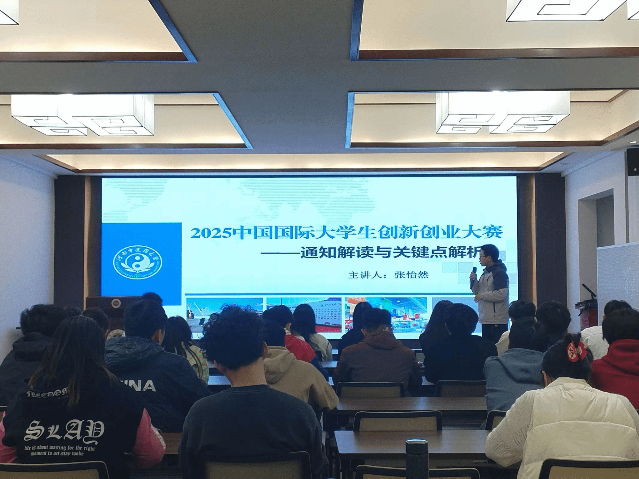 会议伊始,赵申苒介绍了比赛的基本情况和赛事节点,重点解读了赛事规格、参赛要求、赛道设置和评审要点等内容。秦中朋以“趁青春,创无限”为题,从赛事概况、激励政策、参赛方式、团队组建、项目打造、优秀案例等方面进行了全面细致的解读和培训,并鼓励同学们勇于尝试、敢于创新、跨学科跨专业组队,发挥团队协作优势,打造优秀项目作品。2021级张怡然同学结合以往获奖项目和自身参赛经历,从通知解读、关键节点、选题方向和路演技巧等进行专题培训,建议同学们通过模拟答辩打磨项目细节,提升路演表现力,为同学们提供了切实可行的备赛建议和参赛指导,现场气氛热烈。