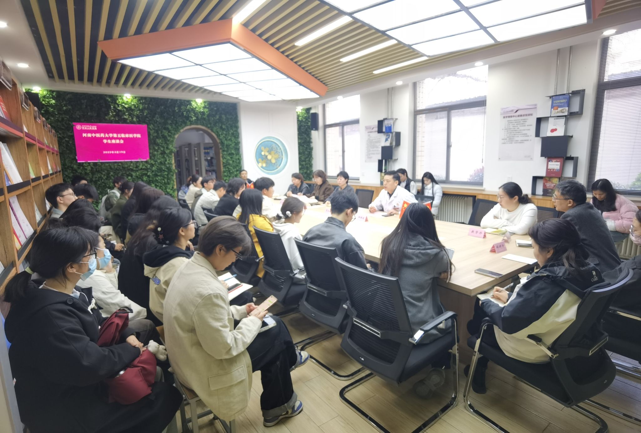 本网讯(文/图 夏文娜)为进一步加强师生沟通,倾听学生心声,提升教育教学质量,2025年3月19日,第五临床医学院在文化路社区医学教育中心一楼学生成长驿站召开“书记院长面对面”学生座谈交流会。学院党委副书记吕雁、副院长樊香、田明波,学工办、教学办、科研办、临床技能中心、餐饮中心、安保部、基建和后勤保障部、公共卫生与健康研究所等职能部门负责人、辅导员、班主任和学生代表近50人参加,会议由学工办主任刘曼主持。