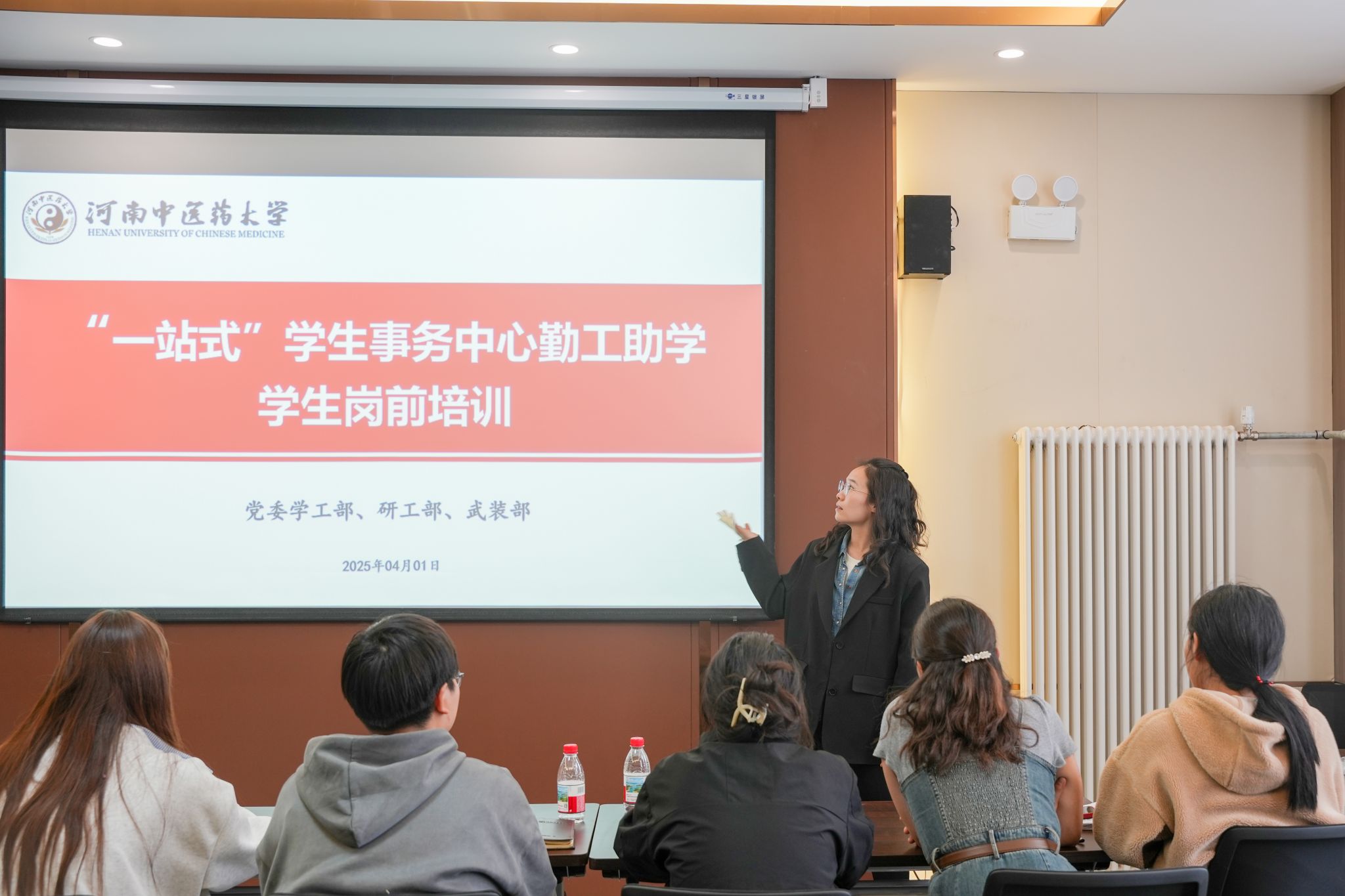 本网讯(文/王海阔 图/张利敏)为提升“一站式”学生事务中心窗口工作人员的整体职业素养与服务能力,进一步强化学生的自我管理与自我服务意识,保障“一站式”学生事务中心服务大厅高质量运转,2025年4月1日,党委学工部、研工部、武装部在“一站式”学生事务中心202社区议事厅组织开展窗口工作人员专题培训。党委学工部、研工部、武装部,教务部,校团委,信息化办公室(网络中心),后勤服务中心等部门的窗口负责老师进行了系统培训,全体窗口服务人员参加。
