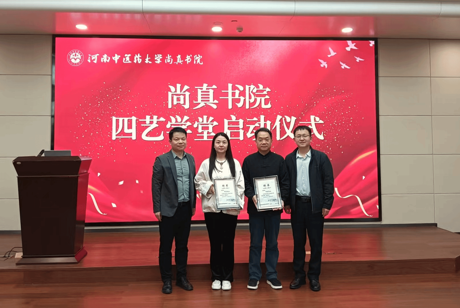 仪式尾声,校团委及书院负责人向校外专家河南省古琴研究会副会长郑建伟、河南省一级青年演奏员郑宗楠以及校内朋辈导师颁发聘书,成功组建起“专业导师 + 朋辈榜样”的双轨师资团队,为学堂教学质量筑牢坚实根基。