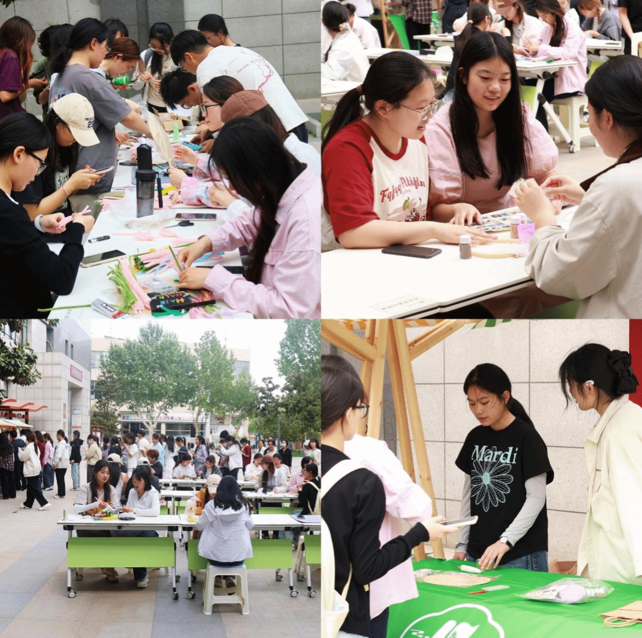 5月6日,创意市集在羽毛球场开启。活动采用“展示+互动”模式,划分创意作品展区与现场制作区。在创意作品展区,大赛获奖作品整齐陈列,艾草锤、香囊、中药纹样发簪等文创产品琳琅满目,不仅展现了中医药文化与现代生活的深度交融,还面向师生开放购买,让创意成果实现“从课堂到市场”的转化。在现场制作区,学生们亲手捶打艾草制作养生锤、调配中药材制作香囊、编织药草造型扭扭棒花束,沉浸式感受“寓医于艺”的乐趣。