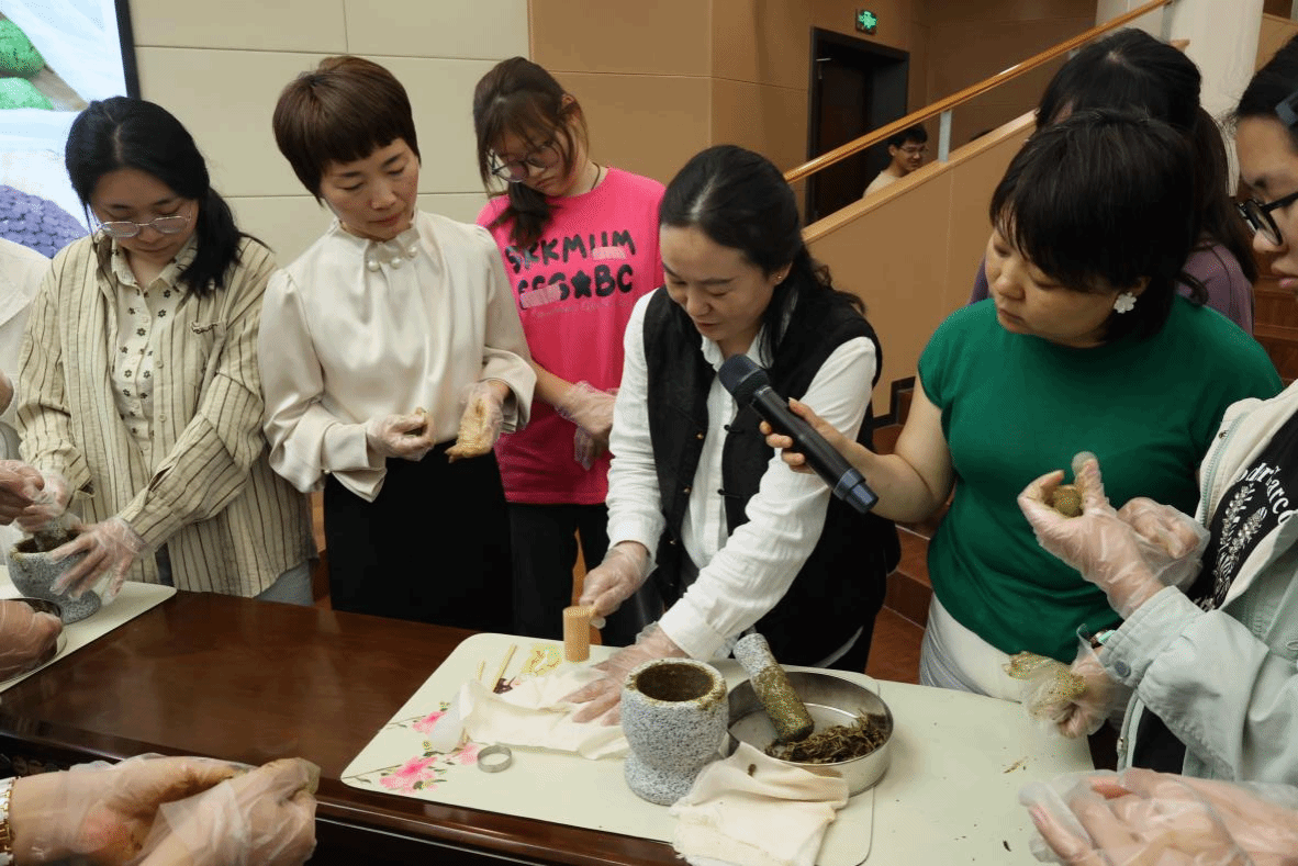 互动环节中,翟老师带领师生亲手模拟《茶经》中的制茶工艺:鲜叶经蒸青软化后,置于陶钵中捣成茶泥,再倒入模具拍压成型,最后焙干穿串。随着一片片饼茶初具雏形,学生们切实感受到 “一片茶叶的千年旅程”。参与体验的学生感慨道:“原来每道工序都藏着古人的智慧,蒸青要掌握火候,捣茶需用力均匀,拍模更讲究形制规整。”翟老师借此强调,非遗传承不仅是技艺复刻,更是对精益求精工匠精神的接续,“传统制茶中的每一步取舍,都是人与茶、人与自然对话的智慧结晶。”