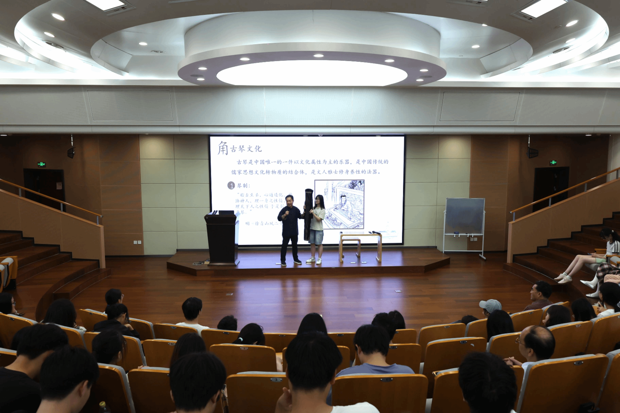 郑建伟以“识琴、琴史、古琴文化、琴器”为主线,阐释了古琴作为以文化属性为主的乐器,集儒家“礼乐教化”等思想于一体,是文人修身养性的工具,其历史可追溯至伏羲、舜帝时期。在五音疗愈方面,郑建伟引《史记・乐书》,说明五音与五脏的对应关系,强调其以“天人合一”为根基,借声波共振调脏腑,兼具中医与现代科学依据。活动现场,郑建伟邀请学生触摸古琴感受音色,并寄语师生以琴为媒感悟传统文化精髓,让千年琴韵在现代健康理念中焕发新生,助力中医药文化与现代疗愈体系的创新融合。
