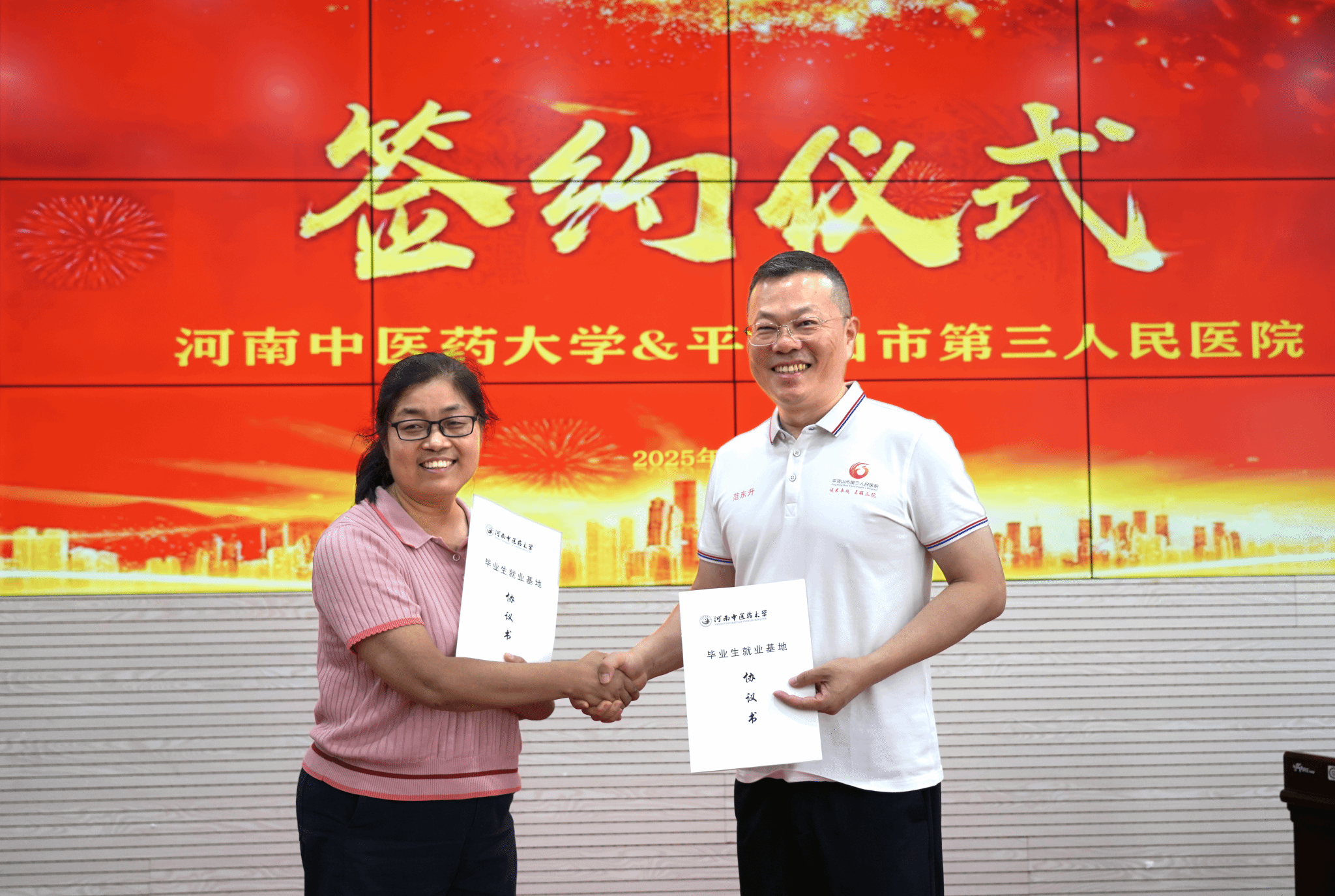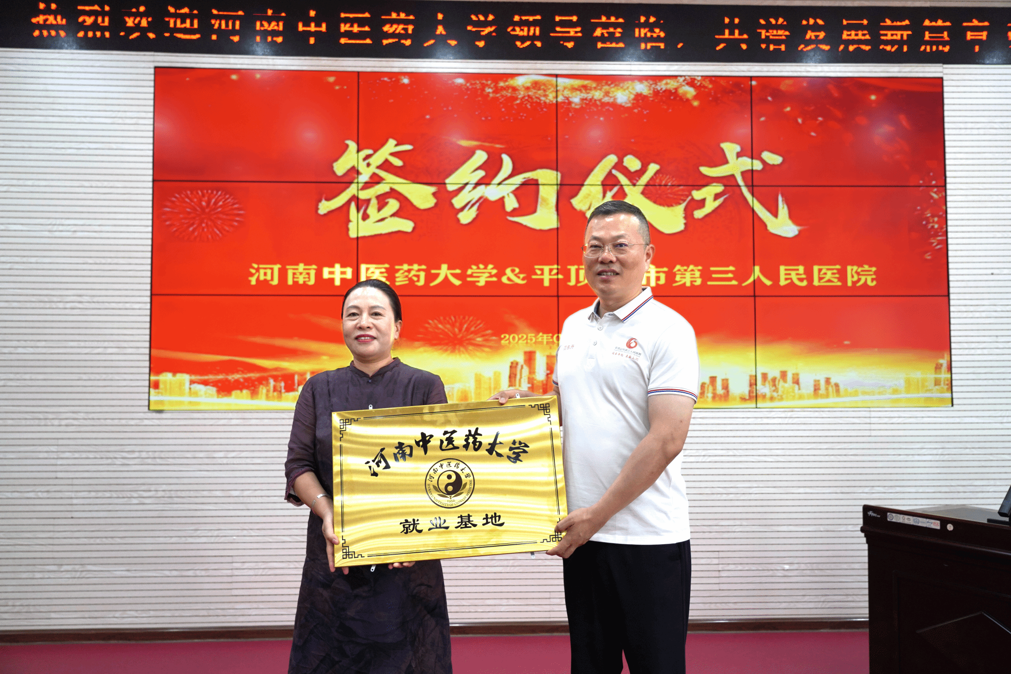 朱庆军一行参观了平顶山市第三人民医院新院区建设情况,深入中西医结合等科室,详细了解了医院发展情况。签约仪式上,范东升介绍了医院人才需求,表达了合作意愿;朱庆军介绍了学院2025届毕业生就业情况。双方签署毕业生就业基地协议并授牌。