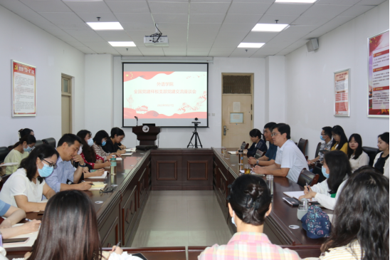 讲座后,外语学院组织召开新时代高校基层党建工作研讨会暨全国党建样板支部党建交流座谈会,杨伟民教授、学院领导班子、各党支部书记、党员代表和全体研究生参加,会议由庞亚宾主持。