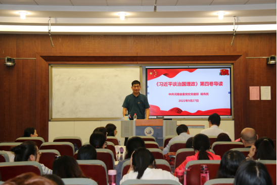 本网讯(文图/秦宇)为深入贯彻学习习近平新时代中国特色社会主义思想,扎实开展《习近平谈治国理政》第四卷学习,推动学院各项工作平稳快速发展,2022年9月27日下午,外语学院邀请河南省委党校党建教研部副主任杨伟民教授作专题讲座。外语学院班子成员、全体老师及研究生聆听讲座。讲座由外语学院党委书记庞亚宾主持。
