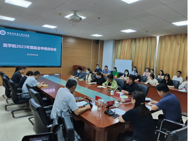 本网讯(文/郭丹丹 图/王白燕)为做好2023年度国家自然科学基金项目申报组织工作,进一步提高项目申报质量和获批率,提升医学院科技创新能力,2022年9月22日下午,医学院在教学实验综合楼A447会议室召开2023年国家自然科学基金申报启动会。院长李根林出席会议,校科学技术处副处长余海滨教授、校第一附属医院副主任医师王贺受邀进行工作指导,学院师生60余人参加会议。会议由副院长孙俊波主持。