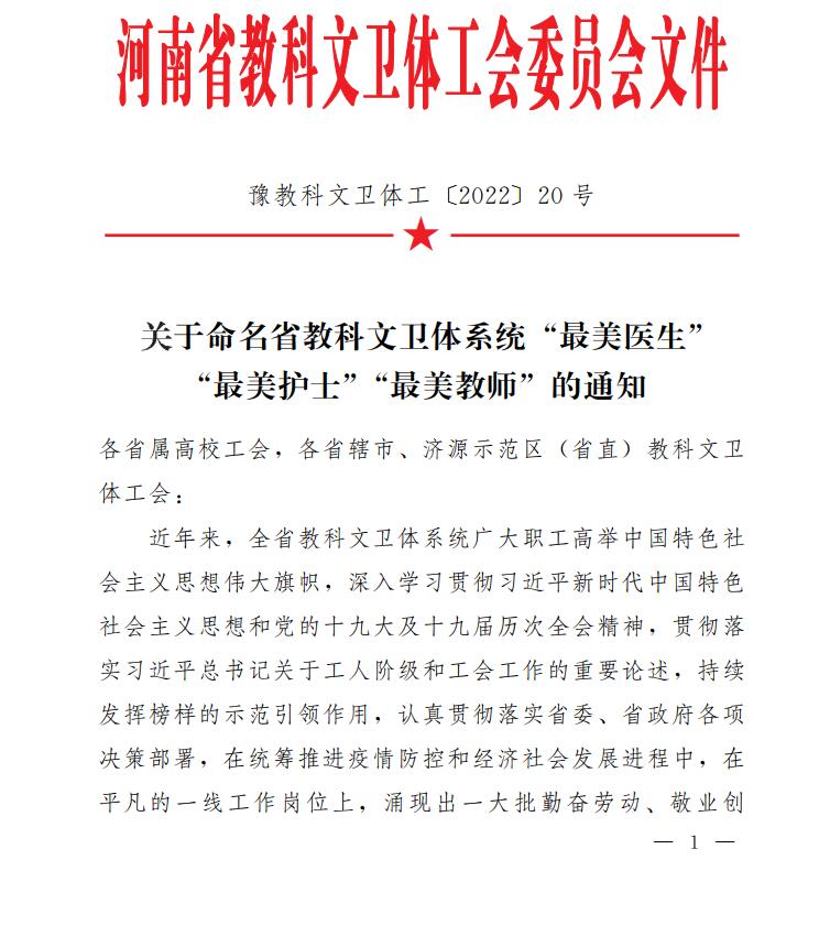 本网讯 (文/图 一、二、三附属医院)近日,河南省教科文卫体工会公布“最美医生”“最美护士”的评选结果。leyu·乐鱼(中国)体育官方网站三附院疼痛科护士长丁晓医荣获河南省教科文卫体系统“最美护士”荣誉,一附院呼吸科护士李振鹏、二附院护理部主任王红霞、三附院重症医学科护士长李玲玲分别获“优秀护士”荣誉,一附院脑病中心办公室副主任王丹、二附院肺病科科主任孟冰、三附院心血管一病区主任范立华获“优秀医生”荣誉。