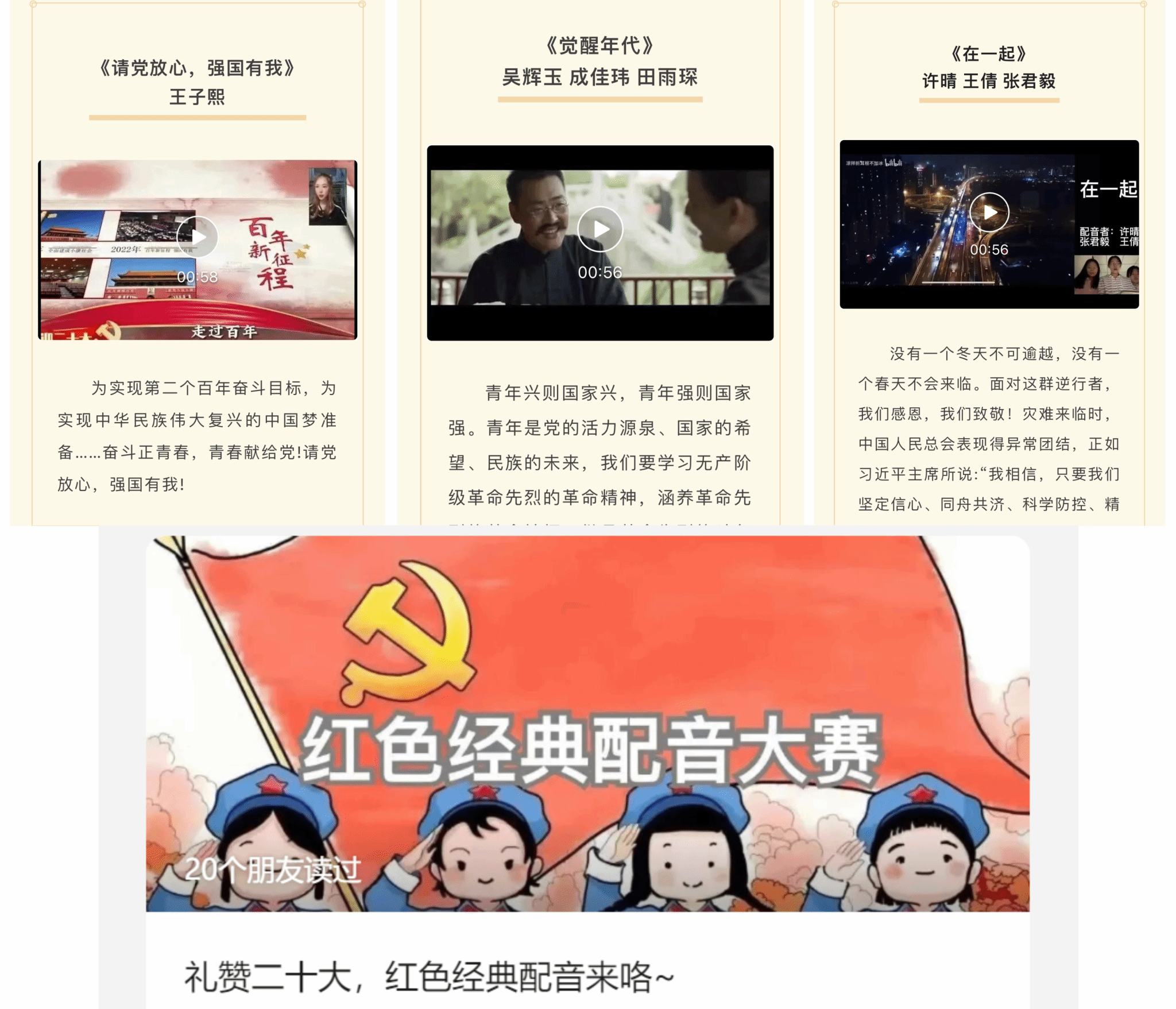 近日,学院通过多种形式积极开展学习党的二十大的活动,讴歌新时代,展望新未来。“礼赞二十大 青春向未来”配音大赛,用青春的声音致敬红色经典、传播红色基因;“喜迎二十大 争当新青年”朗诵活动,在诵读中感受新时代的磅礴力量,在声音中聆听新时代的呼声,感知时代脉搏,争当时代新人;“献给党的二十大的情书”征文比赛,纸短情长,将爱娓娓道来,把心说给党听;公众号“喜迎二十大”专栏,唱响网上好声音,传播网络正能量。