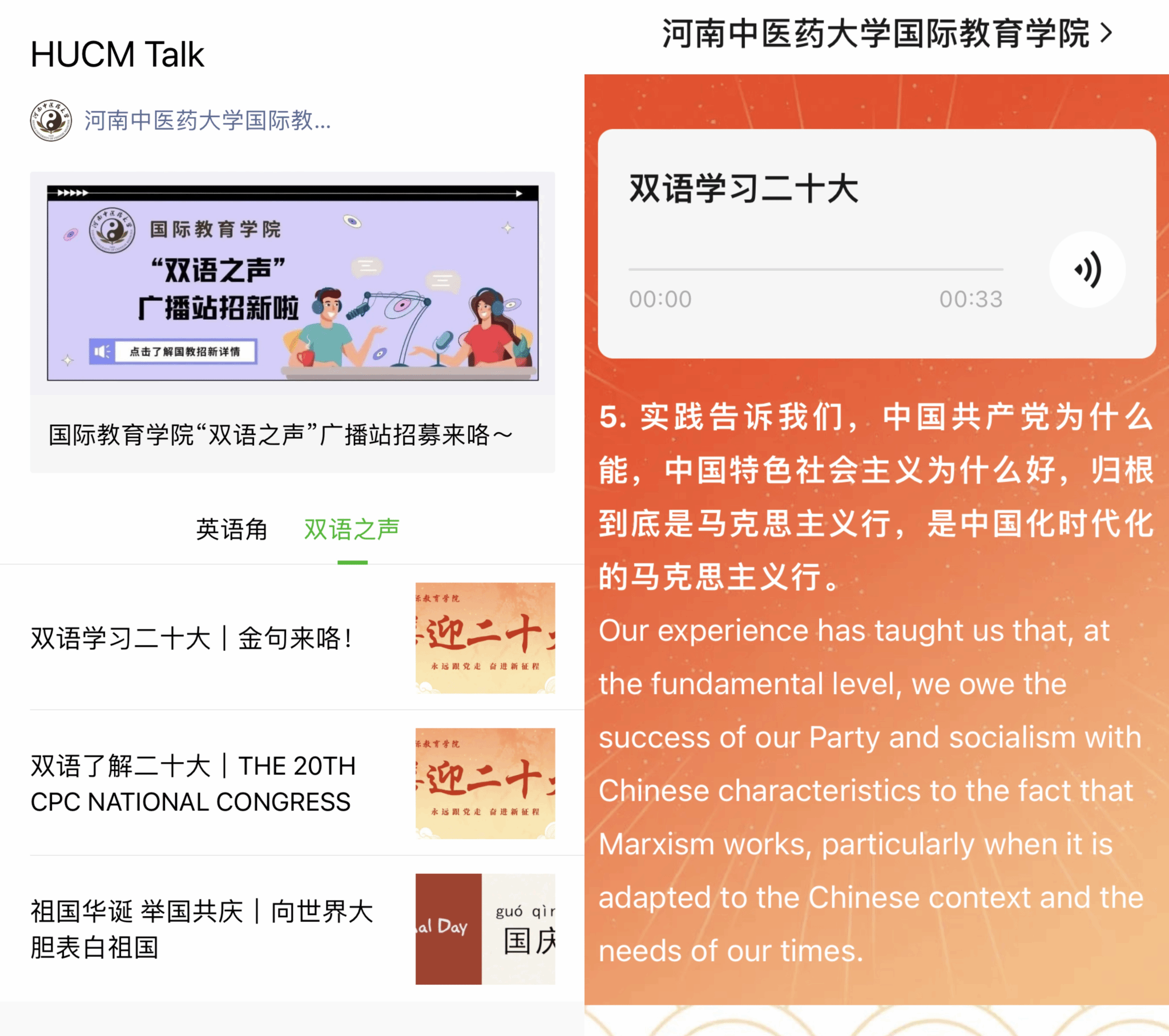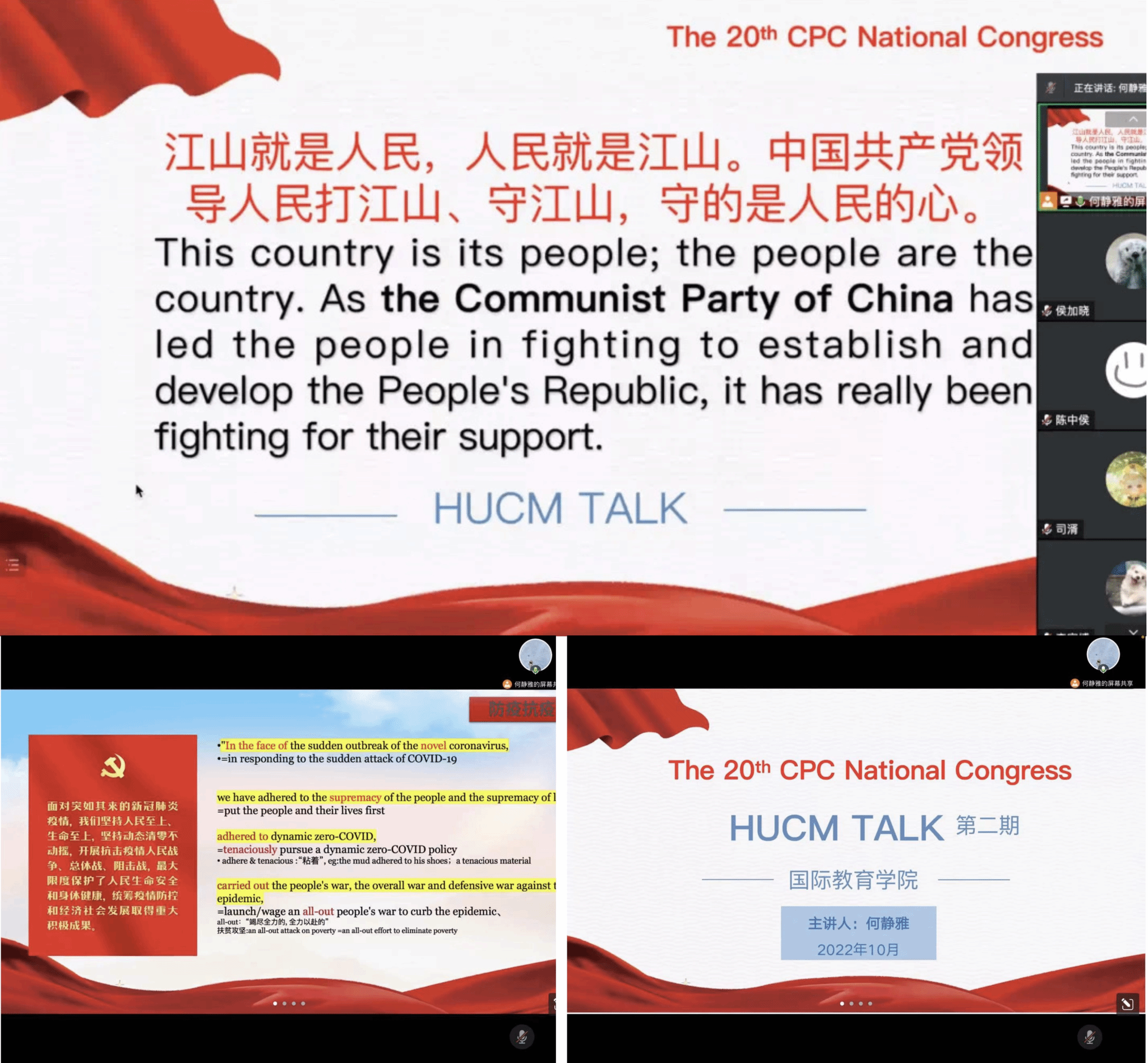 学院特色“HUCM TALK”英语角第二期中,以“双语学习二十大 礼赞新时代”为主题,通过创新课程内容和设计,指导老师给学生上了一堂形式活泼、内容丰富的双语思政课。课后学生们纷纷表示这既是一堂生动的英语学习课,又是一堂深刻的思政课。