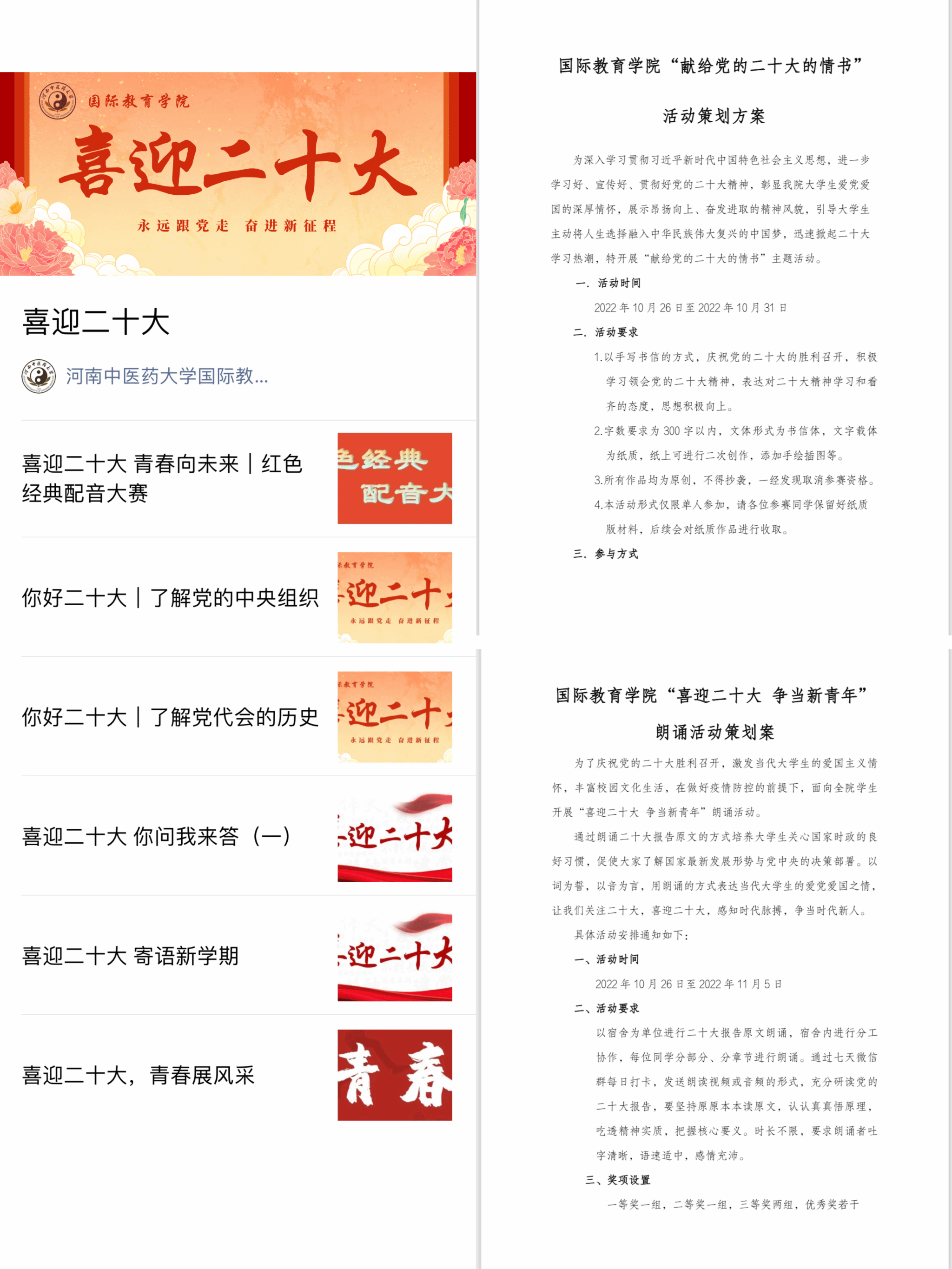 学习宣传贯彻党的二十大系列活动启动以来,全院师生积极响应,广泛参与。今后,国际教育学院还将进一步通过组织多形式、分层次、多方位的学习活动,展现国际化中医药学子的过硬本领、人文素养和爱国情怀,在学以致用中强化责任担当,切实把思想和行动统一到党的二十大精神上来,把智慧和力量凝聚到党的二十大各项决策部署上来,践行为党育人、为国育才的初心使命。