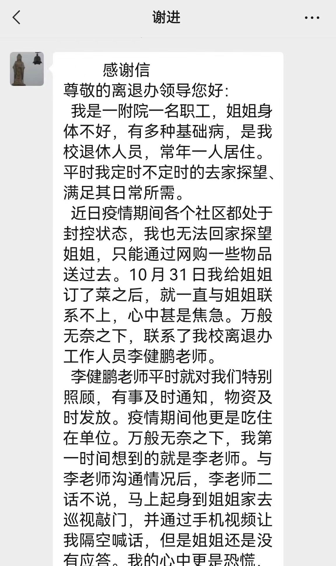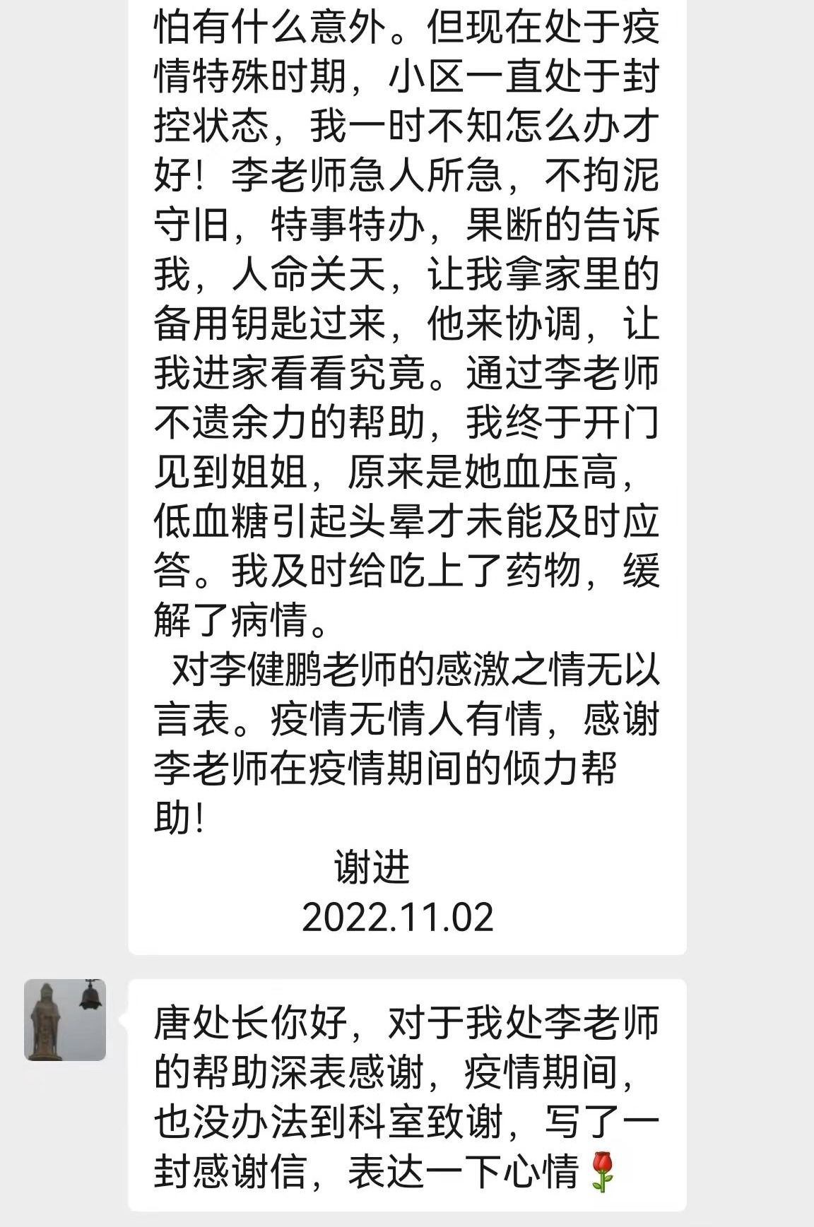 本网讯(文图/程丽娟)2022年11月2日,离退处处长唐陆的微信里收到了一封感谢信。这封信来自一附院职工谢进,信中表达了对东明路校区家属院志愿者服务队,尤其是李健鹏老师的感谢之情。字里行间饱含真情,滋润了志愿者服务队的每位队员,激励着他们以更饱满的热情做好家属院的疫情防控和服务保障工作。