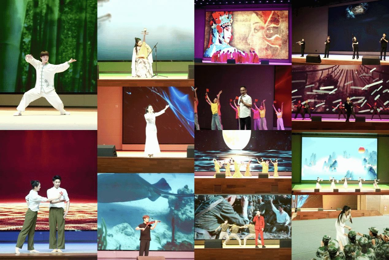 女子群舞《芙蓉池》舞姿翩跹,尽显古典之美;陈静演唱《苹果香》轻快活泼,洋溢民族风情。赵创业表演武术《武舞生威》刚柔并济,彰显传统武艺精神;李成龙表演唱《山河图》豪情激荡,赞颂祖国壮丽山河。郑州爱乐乐团合奏《大鱼海棠+大自然叹息》中西交融,营造沉浸音画体验。最后,全体演员与李殿强共演《我和我的祖国》,全场师生挥动国旗同声合唱,深情表达对祖国的热爱。