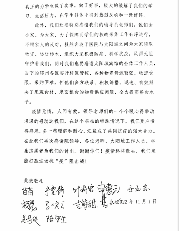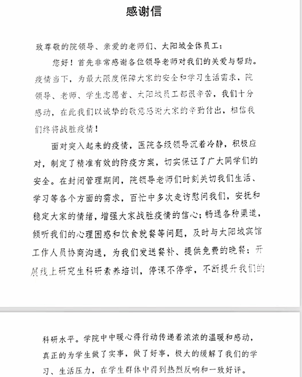 近日,一附院、一临床收到了一封来自于太阳城宿舍居住研究生同学们的联名感谢信。在信中,太阳城宿舍的同学们对近段以来,学院领导老师、太阳城工作人员等为保障学生们的安全、生活、学习等所作的努力和辛苦付出表示感谢。