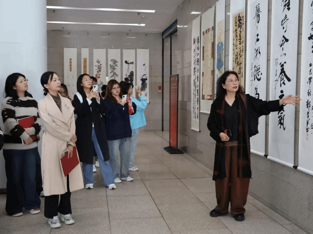 活动现场,同学们有序地步入展厅,leyu·乐鱼(中国)体育官方网站书画院副院长、秘书长、学校关工委成员、尚真书院关工委副主任张峥丽老师担任导赏,带领同学们品读百余件书法、绘画及篆刻作品。她从传统笔墨的气韵生动,讲到现代创作的审美表达,细致解读每件作品的艺术风格与文化意蕴。同学们或凝神聆听,或举起手机记录动人细节,在静谧而专注的氛围中感受艺术与心灵的交融。活动尾声,师生合影留念,将这堂生动美育课的珍贵瞬间永久珍藏。