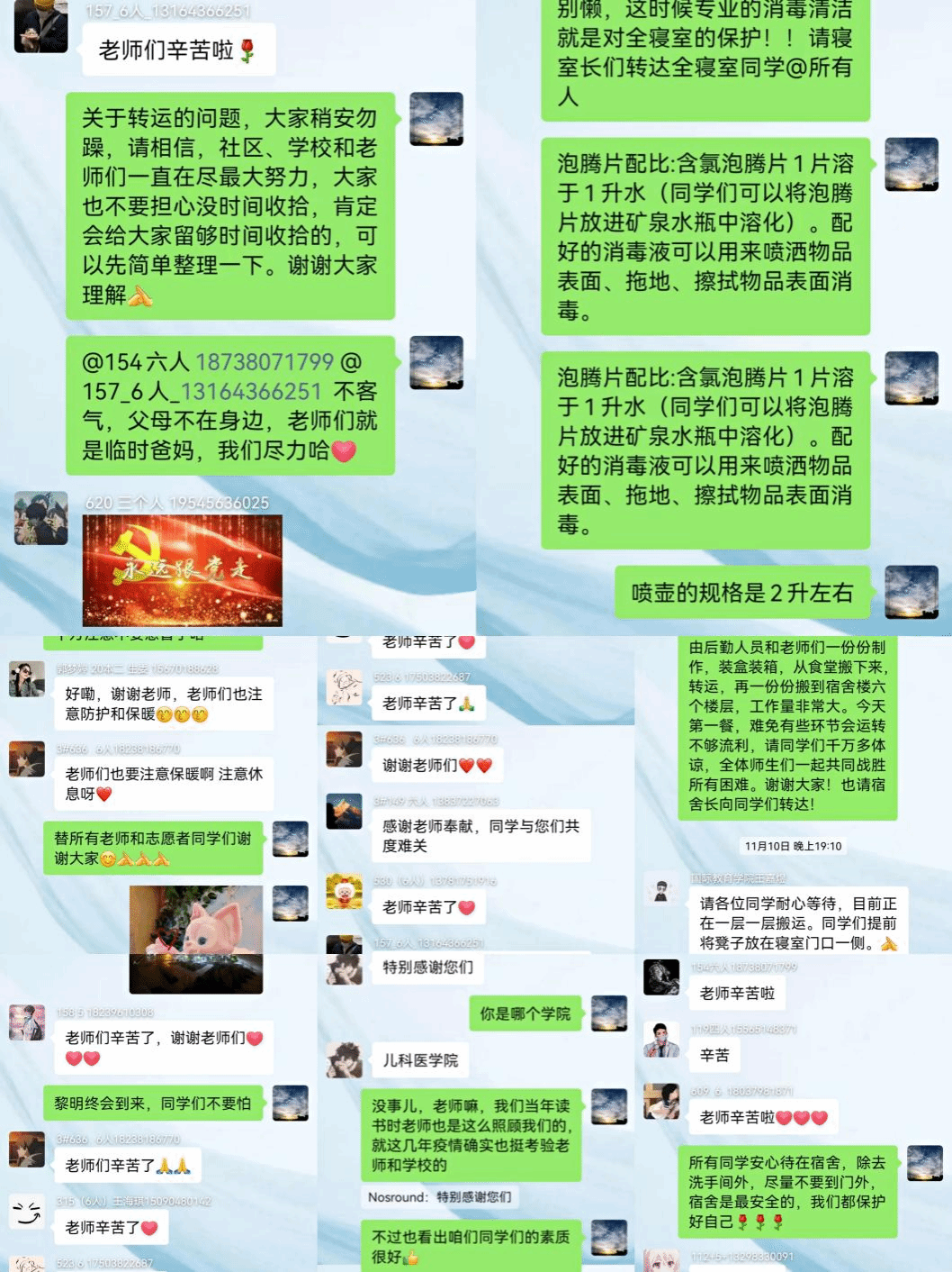 师生携手,同舟共济。领导老师和志愿者同学们的付出大家都看在眼里,暖在心里。“老师们辛苦了,请注意休息”、“坚决服从指挥,不给学校添乱”、“饭菜很好吃,老师和志愿者们辛苦了”、“一心跟党走,老师们是国家的好干部!” ……宿舍静默以来,这是三百多人的学生宿舍长群里最常出现的话语。病毒可以隔离相聚,但绝不会隔离爱。静默的同学们自发主动在门口一侧放上板凳,减少送饭弯腰频率;主动把生活垃圾系紧打包好,减少清理工作量;细心在门口贴上便利贴告知宿舍人数,帮助分发人员节省时间;一些宿舍在门上用纸条写上温馨话语,感谢同学帮助,为志愿者同学加油鼓气;宁静的夜晚,当同学们遇到不放心大家,到楼下巡视的老师们时,会叫来全宿舍的同学们在窗口向老师们挥手打招呼,大声告诉老师:“谢谢老师,我们很好!”……点点滴滴都是同学们爱的表达,朴实而真挚,珍贵且难忘。