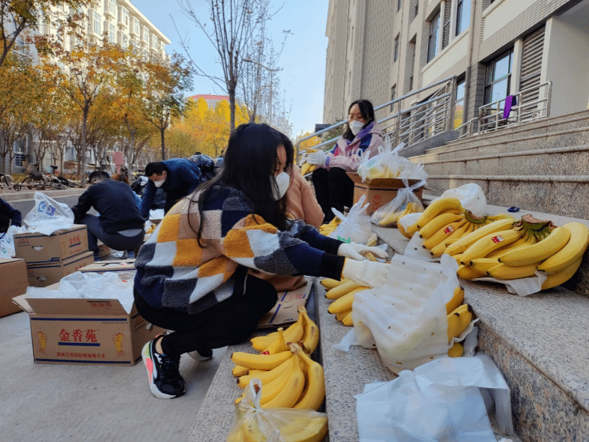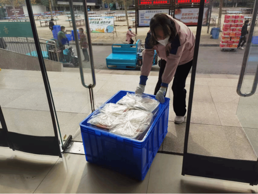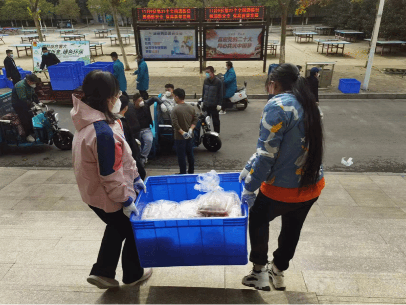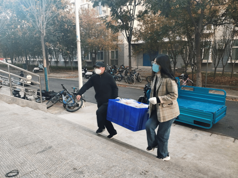 本网讯(文图/陈毅恒)送餐组自11月10日下午开始承担12号楼1812名学生的送餐工作,负责从杏苑餐厅将饭搬运到12号楼前。第一次送餐时人员严重缺乏,送餐组仅有4位老师,面临较大困难。中医学院学院(仲景学院)党委书记张晓东、院长张瑞以及副院长李宁带头加入送餐组,和大家一起搬运饭箱,学校学科办副主任姚建平老师得知情况后迅速赶来支援,餐厅的师傅看到我们人员太少,也抽空帮忙搬运。大家齐心协力,顺利完成了首次送餐工作。送餐的老师们做完核酸,回到办公室吃上晚饭时已是晚上10点半。