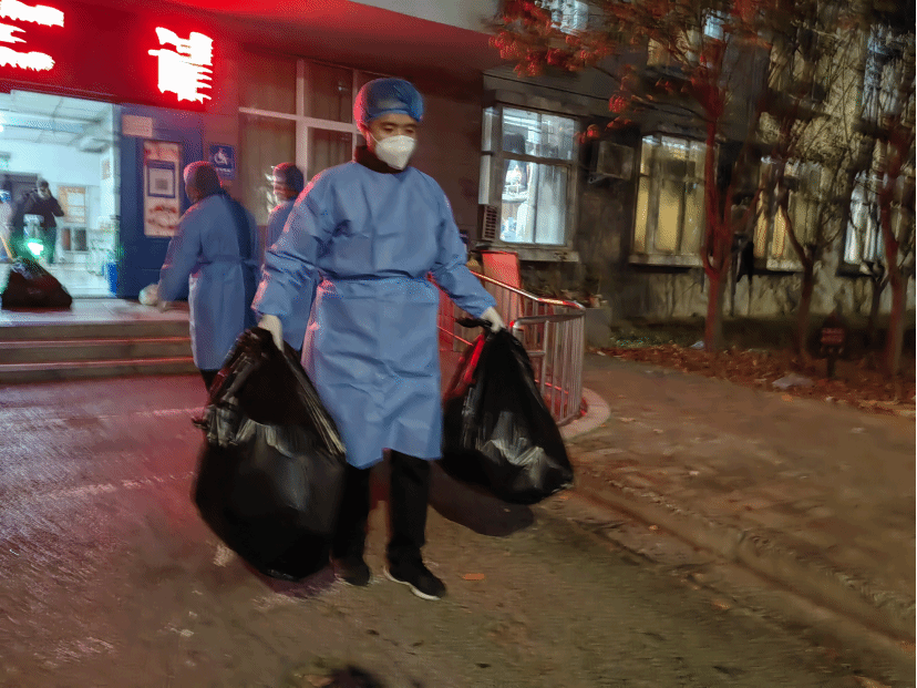 与时间赛跑,与病毒较量。自今年9月28日起,院团委书记、学工办主任陈占科,和学工办魏天贵、张文鑫、李新宇四名男士主动承担起驻守校园一线任务。白纸上写完“坚守”二字只需三秒,现实中陈占科“坚守”已达51天。4个月前,他刚做髌骨骨折手术,忘了腿中钢钉,这些天日行2万余步,送药、送抗原、转运、协调、反馈并解决问题,他用沉稳、勇气和担当,肩负起学工办“第一负责人”的使命任务。魏天贵转战两个校区,当过“大白”采集核酸,做过临时“大夫”,也做过“跑腿”帮学生送药取药,与两个孩子微信聊天时那爽朗的笑便是最动人的一幕。张文鑫,留校30多天,他喜欢校园中同学们的纯真笑容,思念家中的一对儿女。为抗击疫情,校园安静下来了,家里的牵挂也愈发浓烈,而他顾不上这一切,积极投身一线,电话微信不断,送餐保障不停。遇到困难和突发情况,他虽会不安,但始终奔赴一线,无论是凌晨的转运,还是深夜的突发事件处理,始终输出着决心和信心。忙乱中他显得严厉,感动时他会哭泣,这样的坚守他还在持续。李新宇在条件最为艰苦、形势最为严峻的东明路校区一住就是20余天,白天穿着厚厚的防护服帮忙转运,晚上整理各项通知政策。稍有空闲,席地而坐,想起来还有其他任务,喘个大气,告诉自己干就完了,接着拼。这里,还有医院的6名志愿者们,他们通力合作,执行餐饮供应、中药配发、垃圾清运、楼道消杀等任务。他们用睡眠与时间交易,用责任扛起一线任务。学生们的一日三餐、生病时服用的药、空气中弥漫的消毒水味、干净整洁的宿舍、有序的转运,都是他们“舍小家,为大家”,用心、用力、用情奋战出来的。
