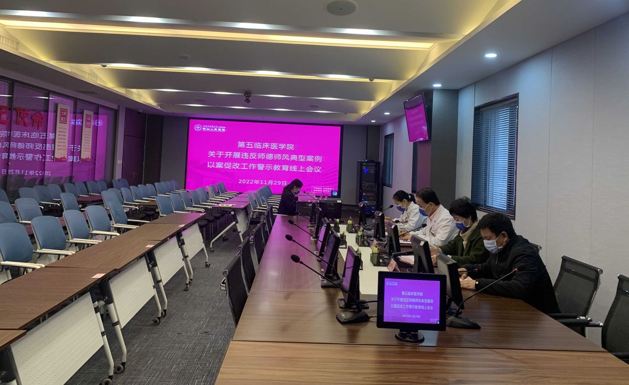本网讯(文图/裴青燕)2022年11月29日下午,第五临床医学院在科研教学中心14楼会议室召开违反师德师风典型案例以案促改警示教育线上会议。第五临床医学院副院长张思森,副书记吕雁,副院长徐慧、李中心,教学督导组成员,各课程负责人,研究生导师,教学办等部室相关人员50余人线上参加会议。会议由教学办主任席一榕主持。