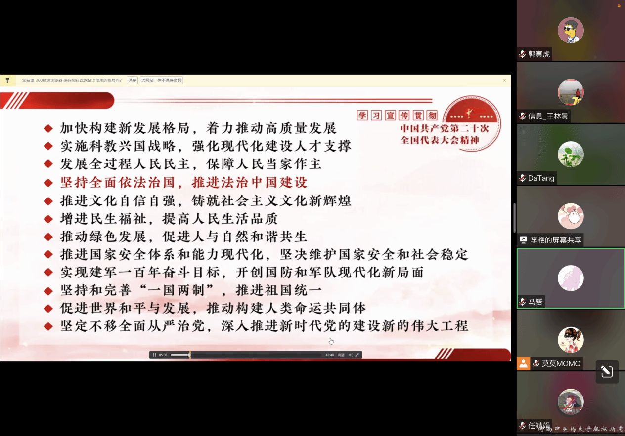 会上,马赟传达了《关于开展“百名法学家百场报告会”法治宣讲活动的通知》《关于开展2022年“宪法宣传周”活动方案》。随后参会人员集体观看了《法治深壹度(2022年)--美好生活,“宪”在开讲》、河南干部网络学院平台由中国政治大学杨伟东教授主讲的《坚持全面依法治国 推进法治中国建设》视频。
