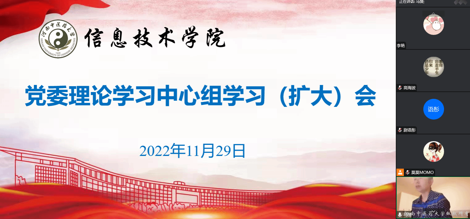 本网讯(文/李艳 图/郭寅虎)2022年11月29日下午,信息技术学院党委召开党委理论学习中心组学习(扩大)会。会议采取线上方式进行,学院领导班子成员以及全体教职工参加会议。会议由学院党委书记马赟主持。