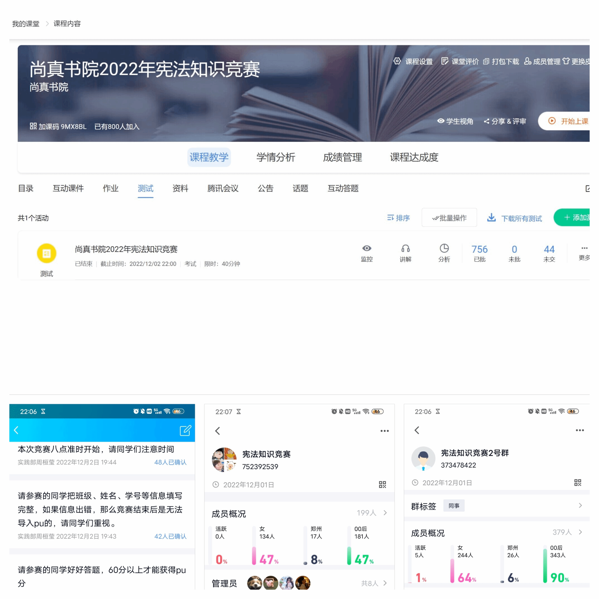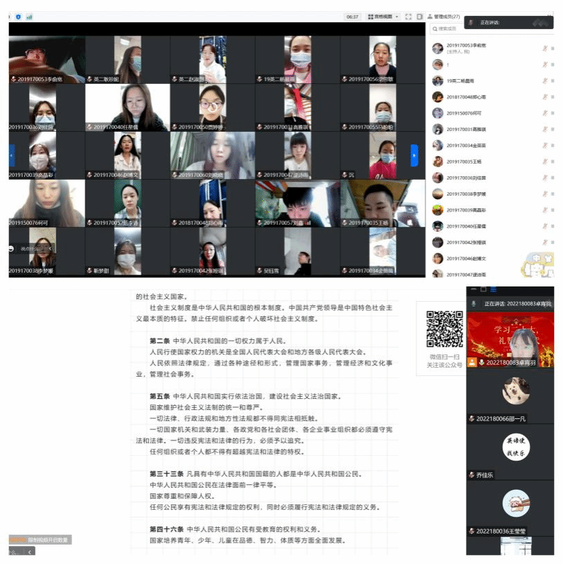 12月2日上午,尚真书院以班级为单位开展线上“宪法晨读”活动,累计共有726名同学参与,由各班学委和团支书组织本班学生集体线上学习。包括了解宪法内容,感受宪法在全面依法治国中的重要作用和意义;观看普法直播,聆听宪法宣读,并全体跟读;交流学习心得,培养法治思维;开展学习交流,并邀请优秀代表为学生分享学习心得,提升学习效果等;各班学委和团支书进行了活动总结。“宪法晨读”活动营造了浓厚的学法氛围,取得了良好的宣传效果。活动加强了全体师生对宪法的认同和了解,提升了全体师生的宪法和法律素养,不断引导广大师生明辨是非、崇礼守法、做“知法、用法、守法”的新时代好青年。