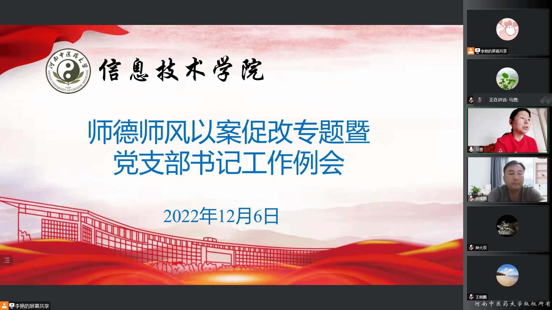 本网讯(文/李艳 图/唐国良)2022年12月6日,信息技术学院通过线上方式召开师德师风以案促改专题暨党支部书记工作会,学院全体领导班子成员和全体党支部书记参加。会议由学院党委书记马赟主持。