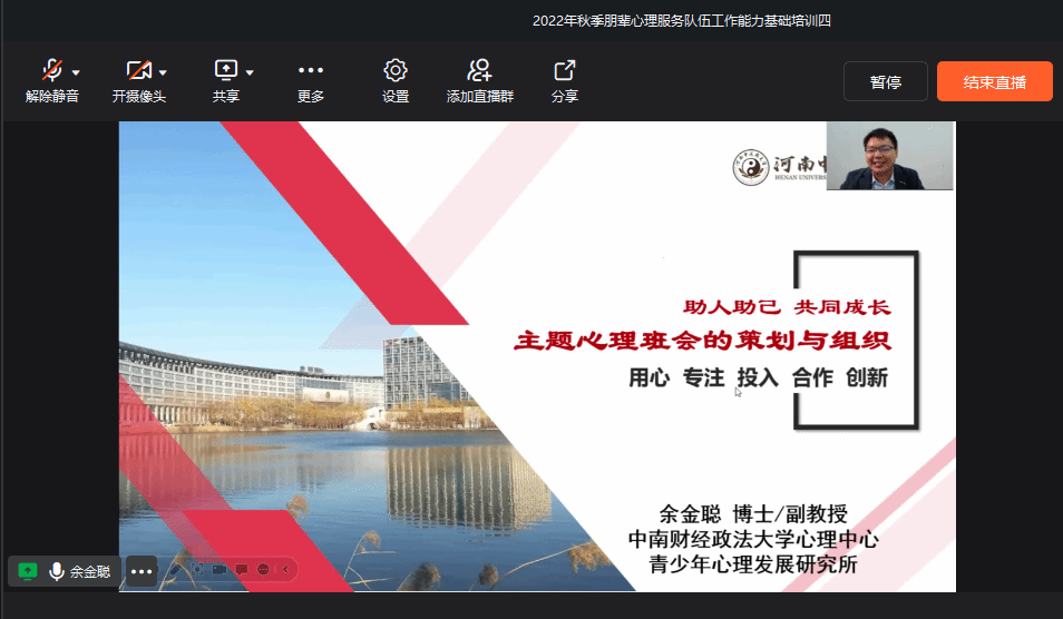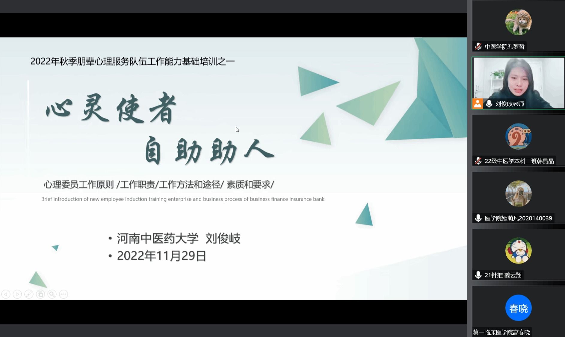 本网讯(文/图 刘俊岐)为提升朋辈心理服务队伍的心理健康知识水平和工作技能,明确工作职责,充分发挥在心理健康教育中的积极作用,学校于2022年11月28日至12月11日,从学校和学院两个层面,采用线上专题培训和网络课程相结合的方式,对全体班级心理委员、学生会心理部成员、朋辈咨询员和宿舍心理健康信息员进行了基础知识培训。