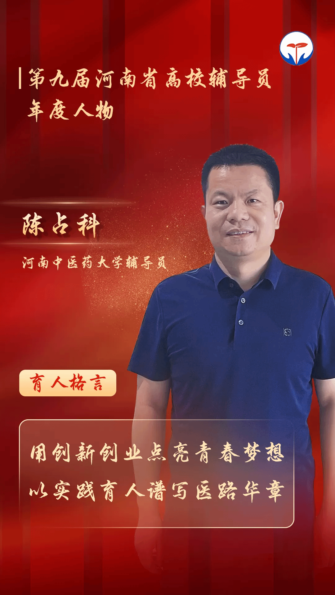 本网讯(文图/程丽娟)日前,由中共河南省教育工委、河南省教育厅主办的第九届全省高校辅导员年度人物评选活动结果揭晓,一临床学工办主任、团委书记陈占科荣获第九届河南省高校辅导员年度人物,成为一临床首个获此殊荣的辅导员。