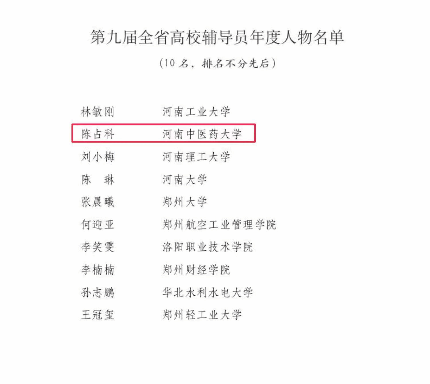 第九届全省高校辅导员年度人物名单截图