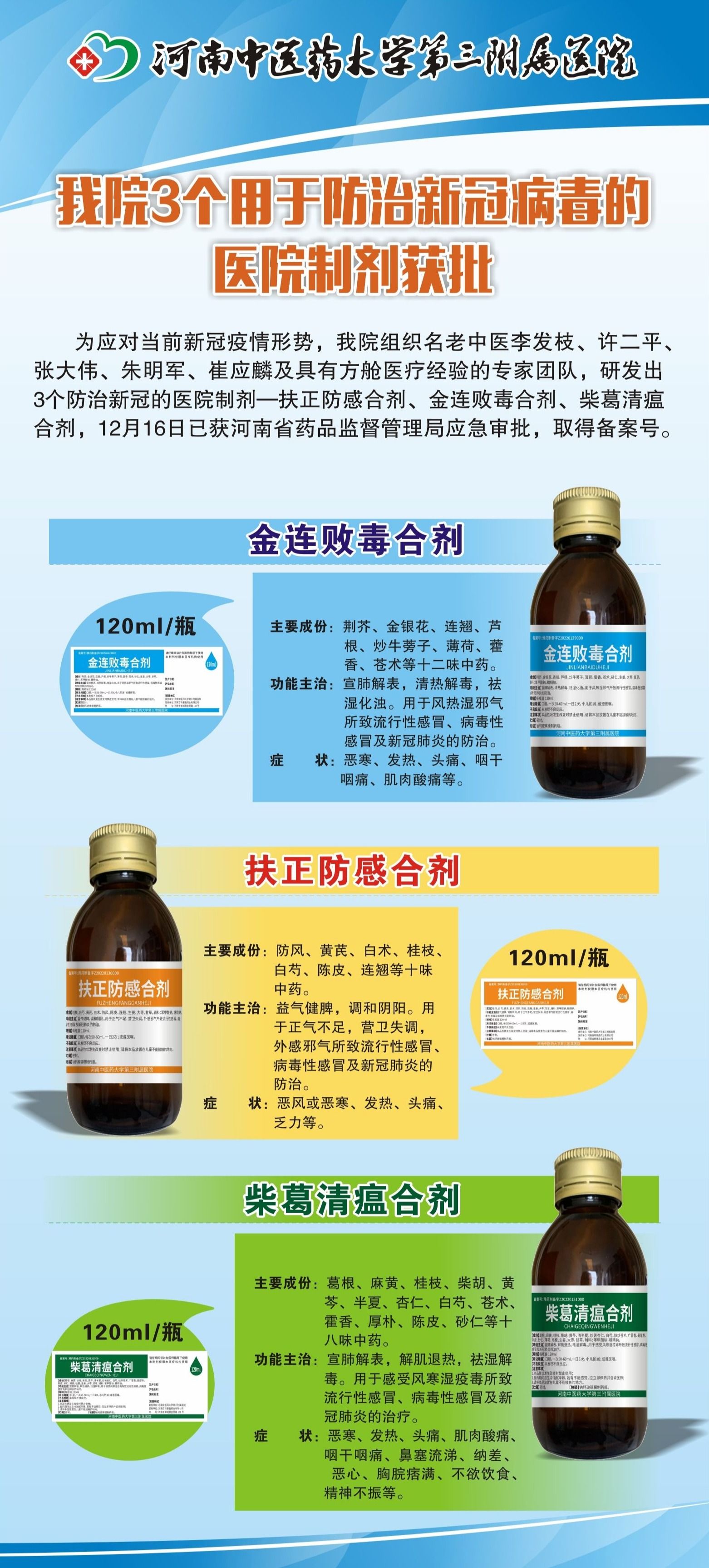 本网讯(文图/于诗航)随着疫情防控政策的优化调整,近日涌现大量新冠感染患者,退热药、清瘟祛疫类中成药供应不足。为应对当前新冠疫情形势,我院组织李发枝、许二平、张大伟、朱明军、崔应麟及具有方舱医疗经验的专家团队和名老中医,针对新型冠状病毒肺炎患者的病理生理特点及证候规律,研发出3个防治新冠的医院制剂——扶正防感合剂、金连败毒合剂、柴葛清瘟合剂,12月16日已获河南省药品监督管理局应急审批,取得备案号。