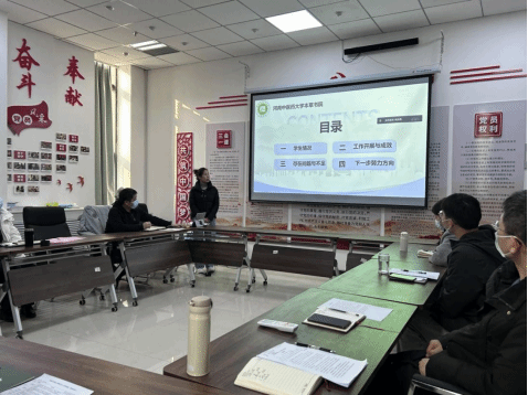 会上,各位老师围绕辅导员工作职责,结合自身工作实际,从学生日常管理、班级建设、思想政治教育、学业指导等方面进行汇报,全方位展示了书院学生工作日常,充分展现出书院辅导员队伍良好的政治素养、扎实的专业技能和昂扬向上的精神风貌。随后,各中心负责人围绕中心工作责任落实、中心工作开展情况、重点工作完成情况以及2023年工作规划进行了全面汇报,大量的数据、文图并茂的展示,呈现出书院一年来建设的丰硕成果,也充分展现出各中心在书院建设过程中做出的努力与贡献。