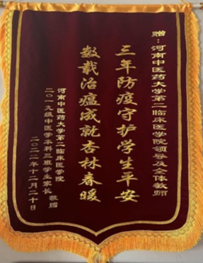 本网讯(文图/万谦)近日,leyu·乐鱼(中国)体育官方网站第二临床医学院收到了一面2019级中医三班学生家长送来的锦旗。锦旗上面绣着“三年防疫守护学生平安 数载治瘟成就杏林春暖”。短短20个字,饱含了学生家长对学院领导三年来防疫工作的支持和肯定,承载了对辅导员老师们为保障学生们的安全、生活、学习等所作的努力和辛苦付出的理解与感谢。