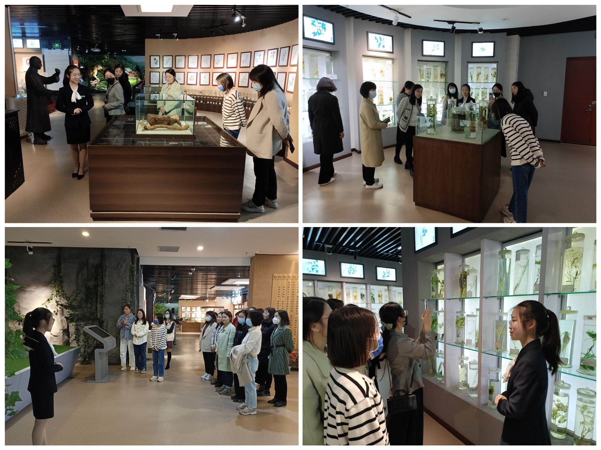 在讲解员的引导下,医学院女教职工一起参观了学校中药馆、校史馆。中药馆里,浸制标本展区、腊叶标本展区、药用动物矿物标本展区从不同角度展示了中药形态和特性,百药苑、百方苑和百穴苑等丰富的廊道文化让各位教师不由地放慢了脚步,仔细观看,大家不由感叹中医药的博大精深。校史馆中,一张张历史性照片全面展示了学校建校60余年在人才培养、科学研究、社会服务、文化传承、国际教育等方面取得的丰硕成果,透过照片,仿佛看到了一代代河中医人和衷共济、接续奋斗的画面,河中医人的自豪感、归属感和荣誉感油然而生。