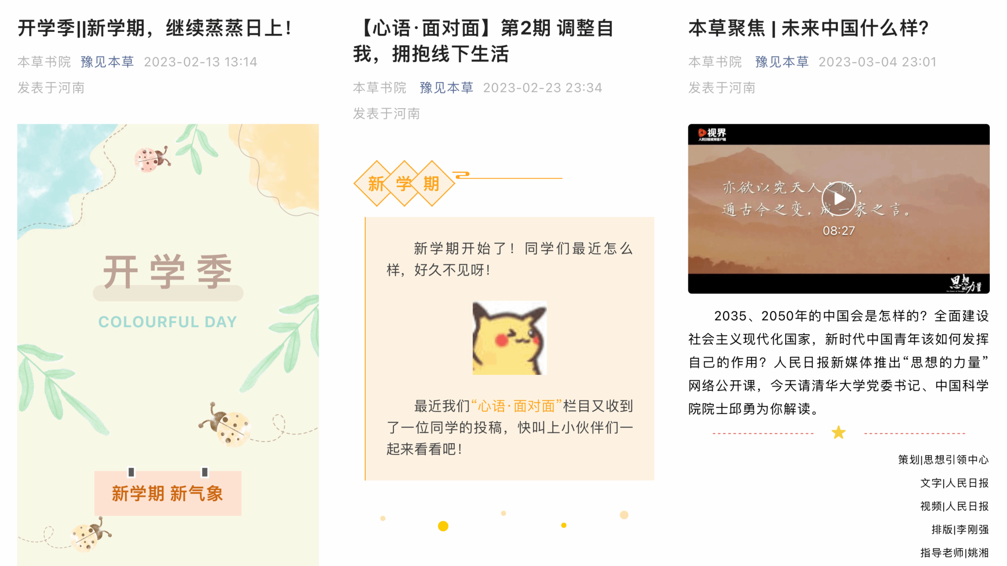 融媒赋能,宣传教育。本草书院注重将党的二十大精神融入校园文化,以书院融媒体矩阵展开系列宣传教育,通过沁润本草微信公众号推送“育人导师思政第一课”,聚焦青年学生关于成长发展的关键问题,用党的创新理论指引方向,铸魂育人;同时围绕党的二十大精神,通过豫见本草微信公众号“本草青年”的相关推文,展示“心系党的二十大,创意手账表心意”活动作品,以师生喜闻乐见的形式,引导学子深刻领会和把握党的二十大精神的丰富内涵和精神实质,激励青年学生放飞梦想、奋辑笃行。