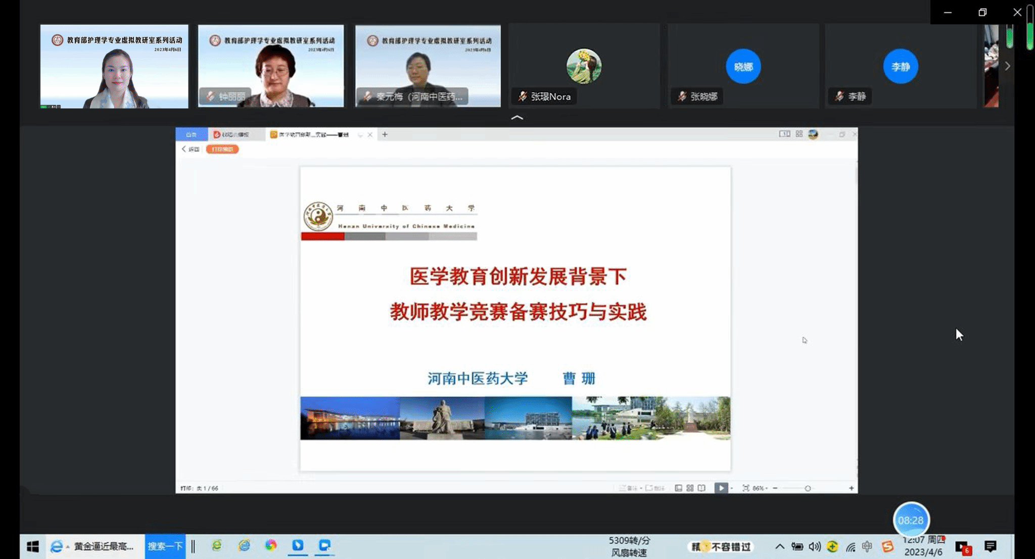 本网讯(文/图张璟)2023年4月6日,leyu·乐鱼(中国)体育官方网站中原教学名师、护理学院院长曹珊教授应邀以线上线下相结合的方式为教育部护理学专业虚拟教研室做师资培训讲座。北京大学护理学院牵头的教育部虚拟教研室成员单位教师、leyu·乐鱼(中国)体育官方网站护理学院教师、实习基地部分教师参加讲座。讲座由护理学院副院长秦元梅及大连大学护理学院社区人文教研室主任钟丽丽主持。