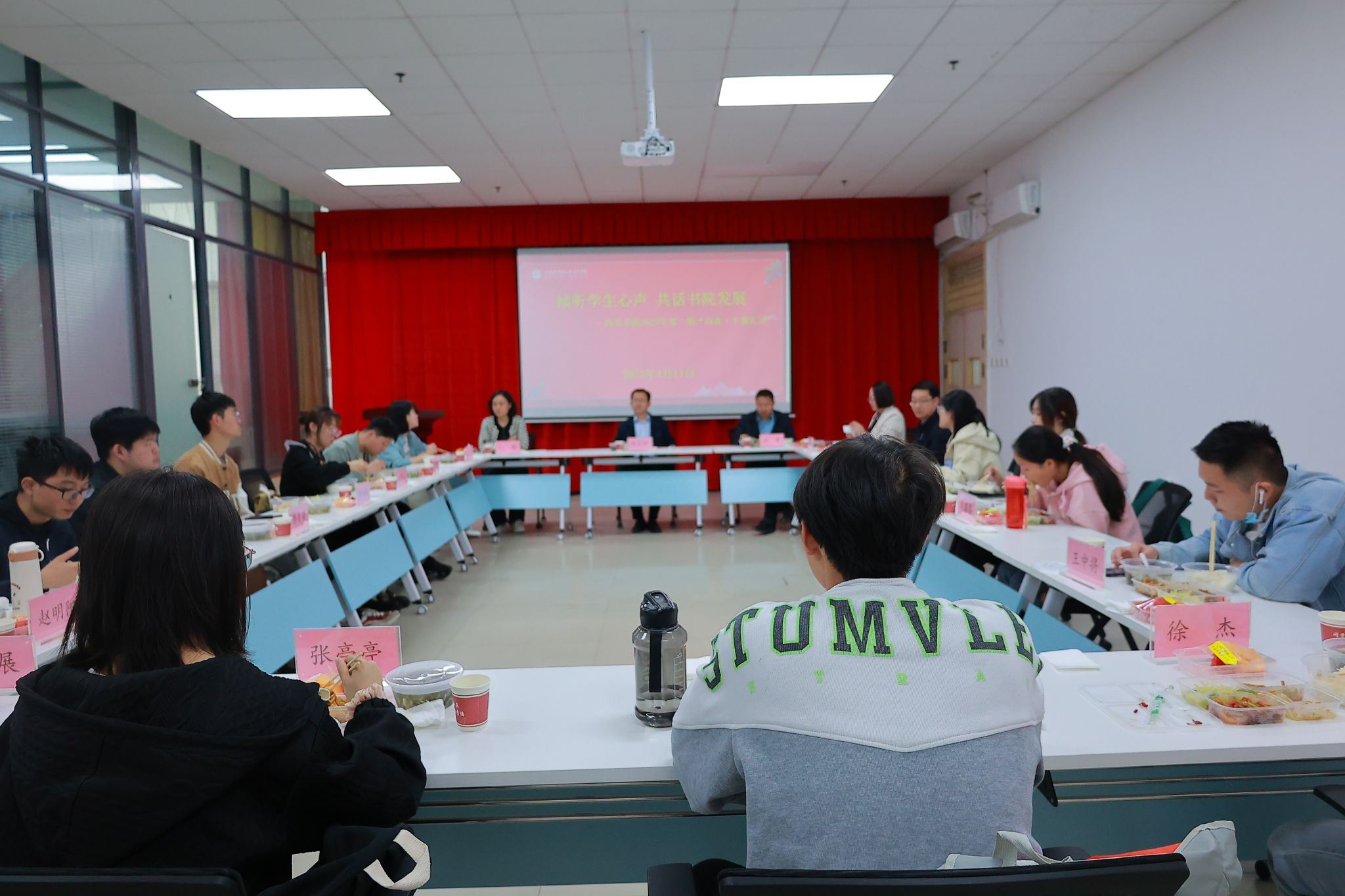 本网讯(文/党瑞金 图/陈旭)2023年4月11日,尚真书院“尚真·午餐汇谈”师生午餐会活动在A129会议室开展。尚真书院党委副书记、副院长李志轩,尚真书院党委副书记苏峰,尚真书院副院长时慧和各中心负责老师与各年级、各专业的学生代表们共进午餐、共话学业、共谋成长。