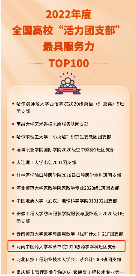 高校活力团支部遴选展示活动是共青团深入贯彻落实“全团大抓基层”,激发团支部活力的重要举措。通过引领力、组织力、服务力、贡献度、改革味、好作风六个方面集中展现高校团支部改革建设成果和典型经验。经过校内选树、校级展示、省级展示、全国展示等环节,本草书院2020级药学本科班团支部成功入围“2022年度全国高校活力团支部最具服务力TOP100榜”。该团支部自成立以来,始终以习近平新时代中国特色社会主义思想为指引,认真学习领会党的二十大精神和习近平总书记关于青年工作、中医药工作作出的重要指示批示精神,贯彻落实上级团组织的各项要求,扎实推进组织建设,躬身志愿服务活动,着力提升专业技能,夯实教育实效,打造正气凛然、朝气蓬勃、才华横溢的团支部形象,先后荣获省级先进班集体、校级优秀团支部、样板团支部等荣誉,支部成员多次获得“省三好学生”“省优秀团员”“优秀学生干部”“优秀志愿者”等称号。