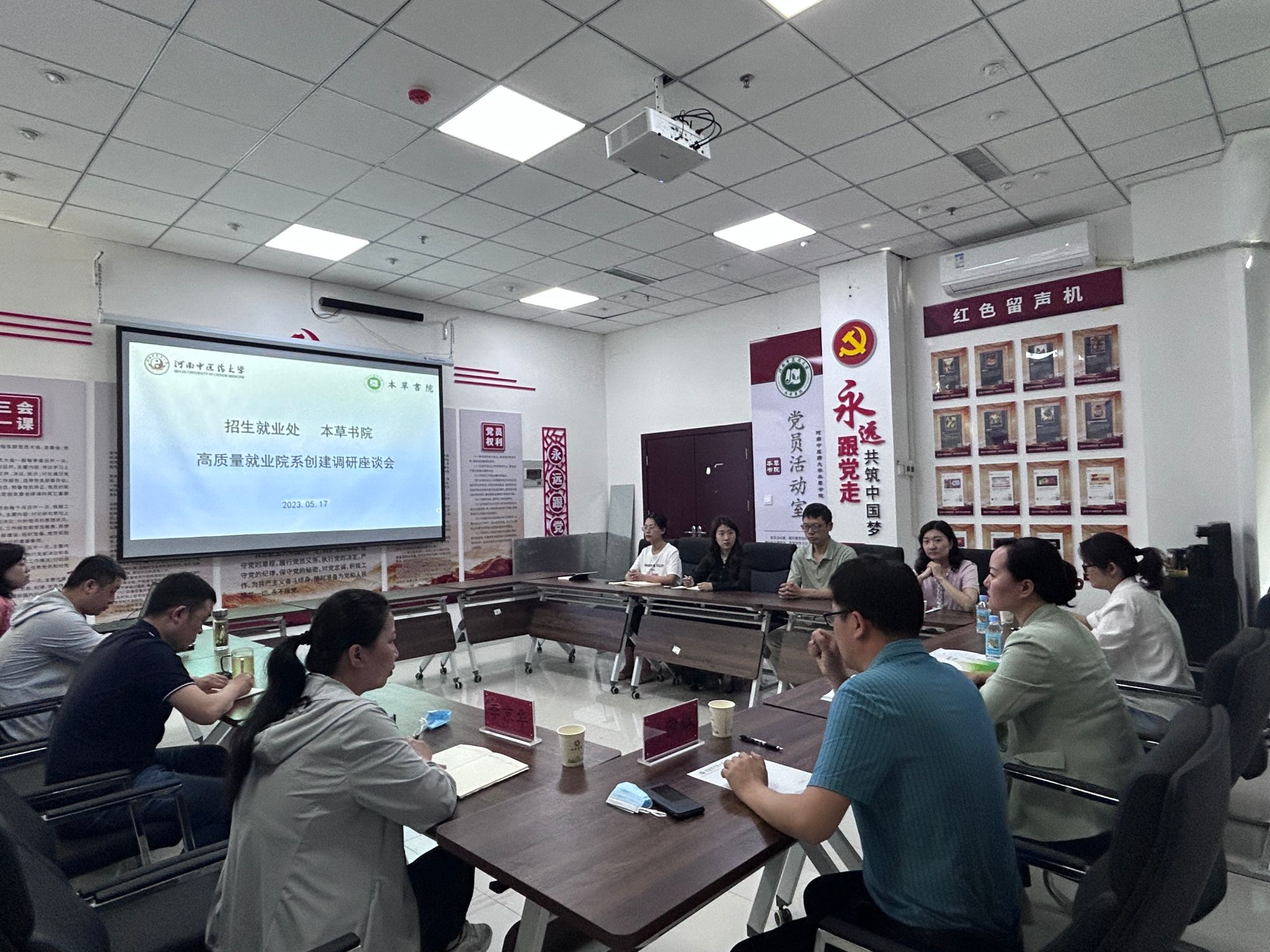 本网讯(文/高巍 图/姚湘)为提升人才培养质量,实现书院学子高质量就业,2023年5月17日,学校招生就业处处长郭婧、副处长王晓蕊到本草书院调研,就高质量就业院系创建工作开展座谈。本草书院党委副书记、副院长刘雅琳,党委副书记李京华,副院长邢瑶及全体育人导师参加,会议由邢瑶主持。