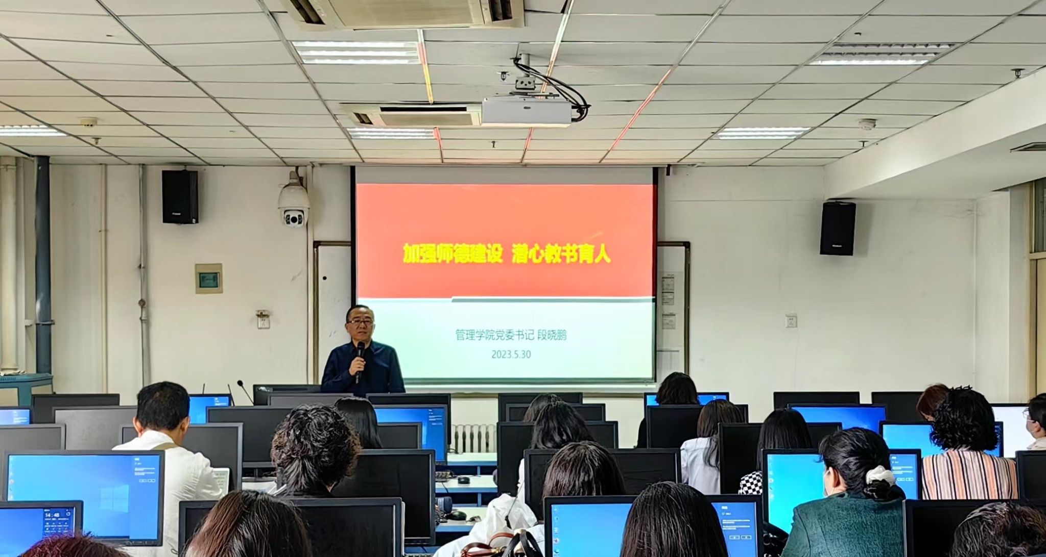 会议伊始,参会人员集体观看了中共中央政治局5月29日就建设教育强国进行第五次集体学习的新闻报道,及时学习了习近平总书记关于“加快建设教育强国,为中华民族伟大复兴提供有力支撑”的重要论述。学院党委书记段晓鹏以《加强师德建设 潜心教书育人》为题,以党课的形式从坚定理想信念、陶冶道德情操、涵养扎实学识、勤修仁爱之心等四个方面逐一展开进行了师德师风宣讲,带领大家对党的二十大报告中关于加强师德师风建设和培养高素质教师队伍的论述、习近平总书记在中共中央政治局第五次集体学习、在全国教育大会、在视察中国人民大学、清华大学等多个场合发表的关于师德师风建设的系列重要论述进行了学习。宣讲中,段晓鹏以黄大年、张桂梅等师德典型的感人事迹鼓励大家向榜样学习,努力做到学为人师、行为世范。他还领学了《中华人民共和国教育法》《中华人民共和国高等教育法》《新时代高校教师职业行为十项准则》《教育部关于高校教师师德失范行为处理的指导意见》及学校下发的《关于在全校开展“奋进新征程 志做大先生”师德主题教育活动的通知》《关于在全校党员干部中开展“明方向、立规矩、正风气、强免疫”专题纪律教育的实施方案》等文件。段晓鹏勉励大家贯彻党的教育方针,强化师德师风建设,争做“四有好老师”,当好“四个引路人”,做到“四个相统一”,坚守三尺讲台,潜心教书育人,以实际行动为党的教育事业贡献自己的力量。随后,副院长王孺对教育部公开曝光第十二批7起违反教师职业行为十项准则典型案例、《leyu·乐鱼(中国)体育官方网站以案促改工作警示教育》中典型案例等进行通报,要求全体教师结合警醒案例,深入查找教学中存在的风险点,持续抓好以案为鉴,以案促改,使警示教育常态化,做到引以为戒,警钟长鸣。副院长毛海燕从课堂教学管理方面强调师德师风的重要性,教育引导教师做“经师”与“人师”的统一者。