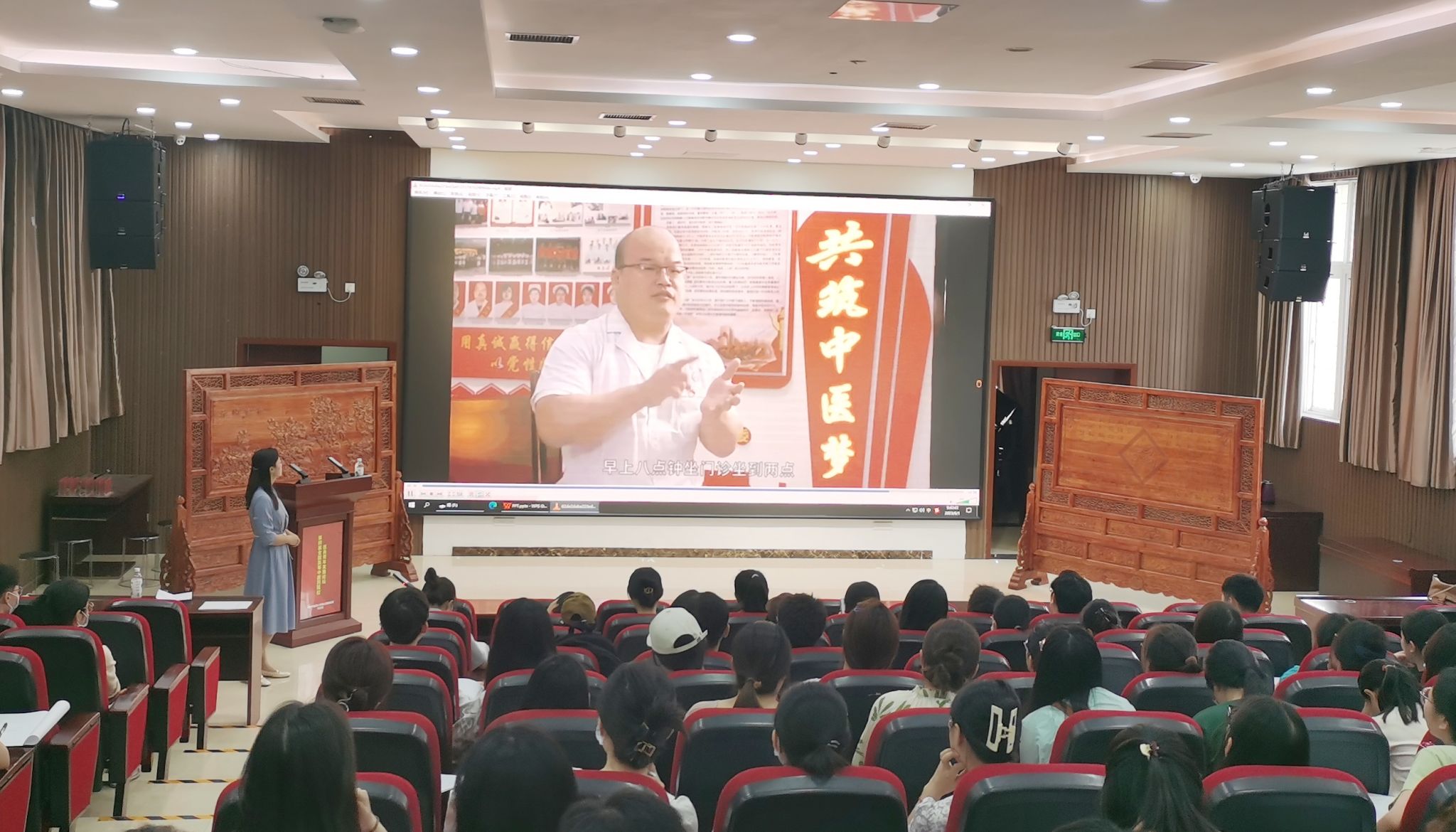 为激励毕业生筑梦基层、挺膺担当,现场还播放了学院优秀基层就业毕业生王帅的事迹视频,视频讲述了他在硕士研究生毕业后扎根基层,从一名年轻中医成长为当地名中医的经历,给学生带来了积极的思想触动。
