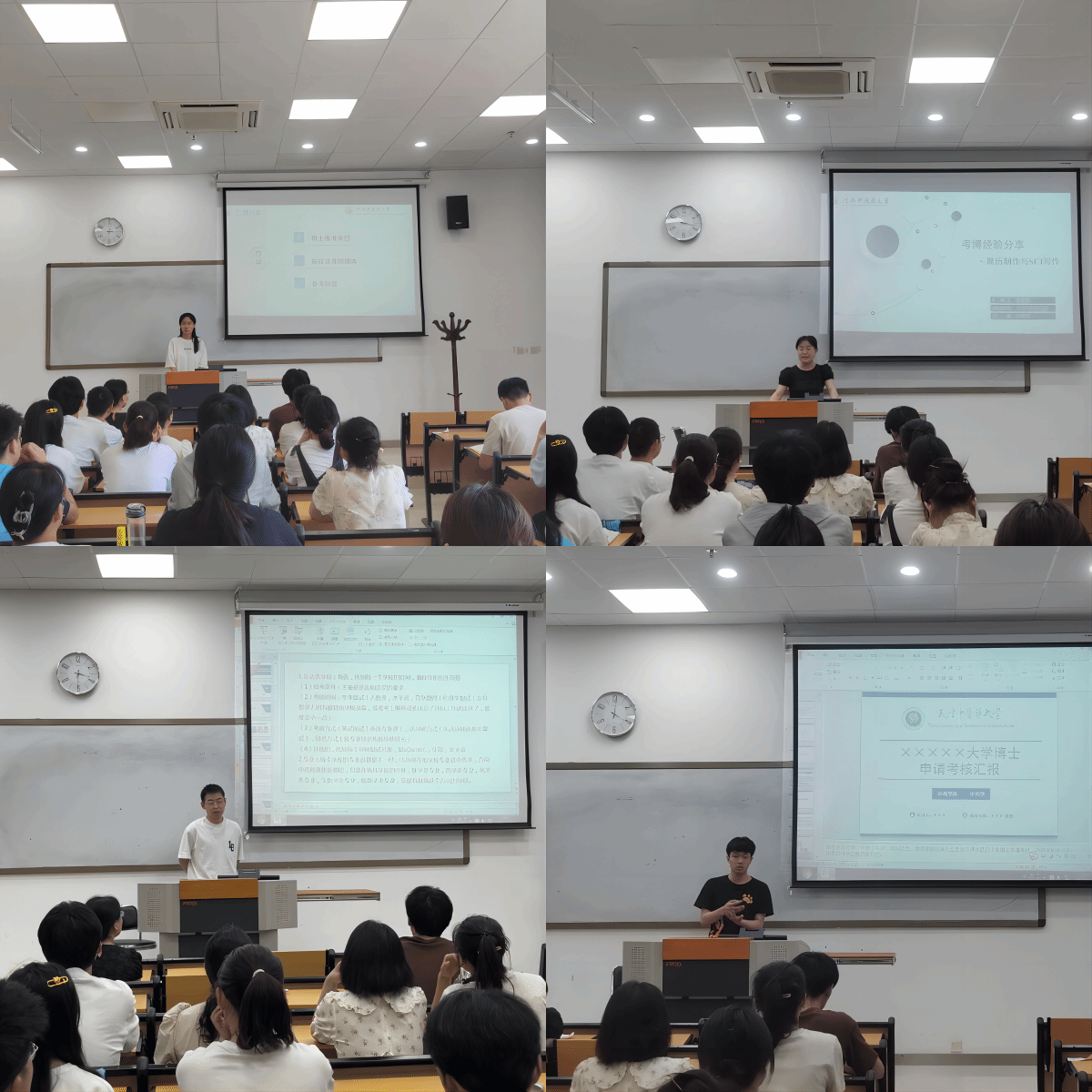 活动中,秦中朋首先通报了学校和学院近3届硕士研究生的就业形势、就业去向和考博情况,希望意愿考博的同学们早做规划、科学备考、心态良好,从本次考博经验交流会中汲取经验和方法,坚持不懈并最终实现心中的梦想!刘萌以《坚定目标,奔赴梦想——考博经验分享》为题,详细介绍了博士报名流程、招生方式和注意事项,并重点围绕“申请——审核制”博士备考如何根据收集招生信息、选择导师和考博自荐等进行经验分享;张钦钦以《心有繁星,沐光而行——博士研究生备考之路》为题,从博士备考前的科研成果准备、报考简历制作和SCI论文写作等方面进行了如何提升报考“硬实力”的讲解;朱跃通以《笃学慎思,知行合一——考博经验谈》为题,结合自身报考经历特别强调了训练英语能力水平和阅读报考专业文献的重要性,并分享了相应的提升方法和技巧;阮元以《人生在勤,勤则不匮——考博经验分享》为题着重分享了考博过程中的心态处理和面试经验,鼓励大家以良好的心态处理好科研和申博途中的每一个可能的挫折。随后四位主讲人分别针对同学们的问题进行了针对性答疑解惑,现场同学们纷纷表示干货满满、收获颇丰、受益匪浅。