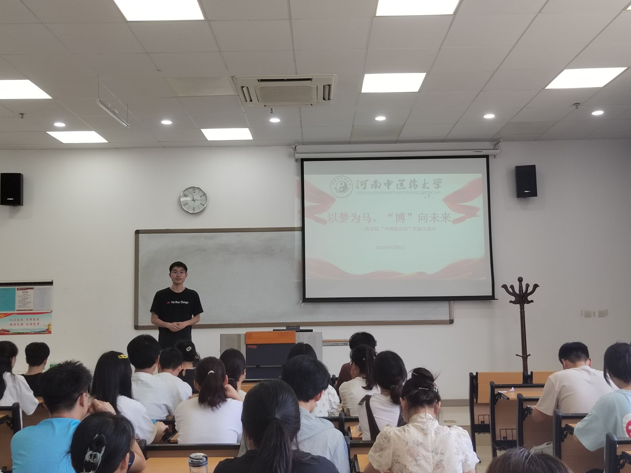 本网讯(文/秦中朋 图/张艳丽)为进一步推动学习贯彻习近平新时代中国特色社会主义思想主题教育走深走实,切实为考博研究生办实事、解难题,帮助备考研究生明确方向、提升备考信心与效率,对考博有一个更全面、更具体的规划,2023年6月9日,药学院于教学实验大楼A132教室开展以梦为马,“博”向未来——研究生“考博面对面”经验交流会,邀请刘萌(考取黑龙江中医药大学)、张钦钦(考取leyu·乐鱼(中国)体育官方网站)、朱跃通(考取西北农林科技大学)和阮元(考取天津中医药大学)4位优秀“准博士”分享考博心路历程和备考经验,研工办辅导员张艳丽、秦中朋和各年级80余名研究生代表参加活动。