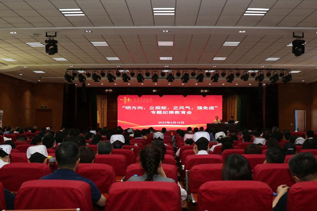 本网讯(文/张马玉 图/廉万营)为深入贯彻落实党的二十大精神和习近平总书记关于严明党的纪律和规矩的重要论述,深化医院党风廉政建设和清廉医院创建,坚持不懈把全面从严治党向纵深推进,6月15日,二附院在会议中心召开“明方向、立规矩、正风气、强免疫”专题纪律教育会。省纪委监委驻省教育厅纪检监察组主任杨志诚应邀出席会议,二附院在郑班子成员、各党总支书记、支部书记、科室主任、副主任、护士长及重点岗位工作人员三百余人参加会议。会议由二附院党委副书记、纪委书记王倩主持。