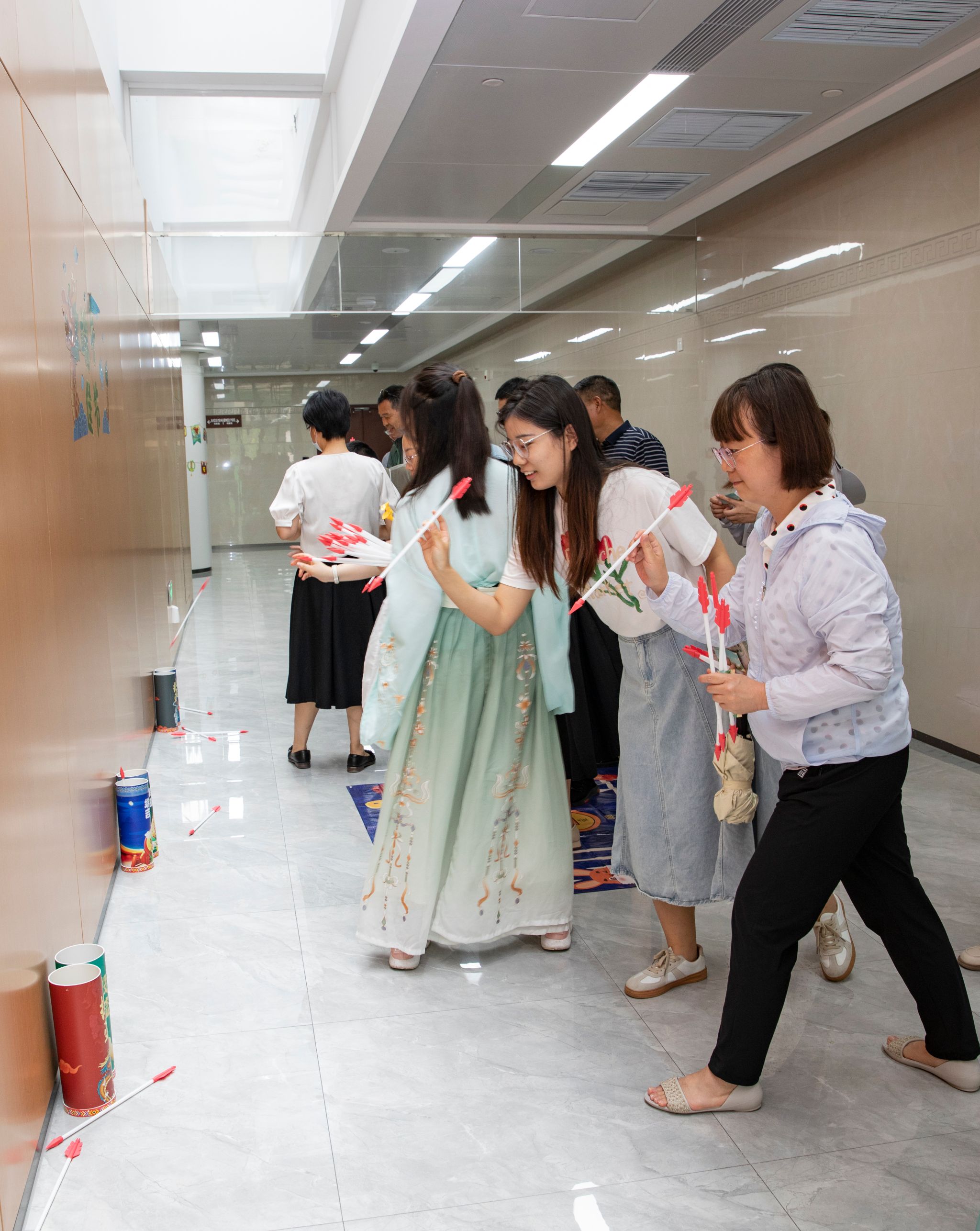 活动现场井然有序,热闹非凡。在“射五毒”现场,老师们饶有兴趣地观看引导员示范,随后跨步、拉弓、搭箭、射击,动作熟练、一气呵成。投壶现场、灯谜墙、互动游戏区也时不时传来老师们的欢声笑语。活动过后,老师们有序来到主席台领取香囊、五彩绳、艾草膏、粽子等学校工会精心为大家准备的伴手礼。