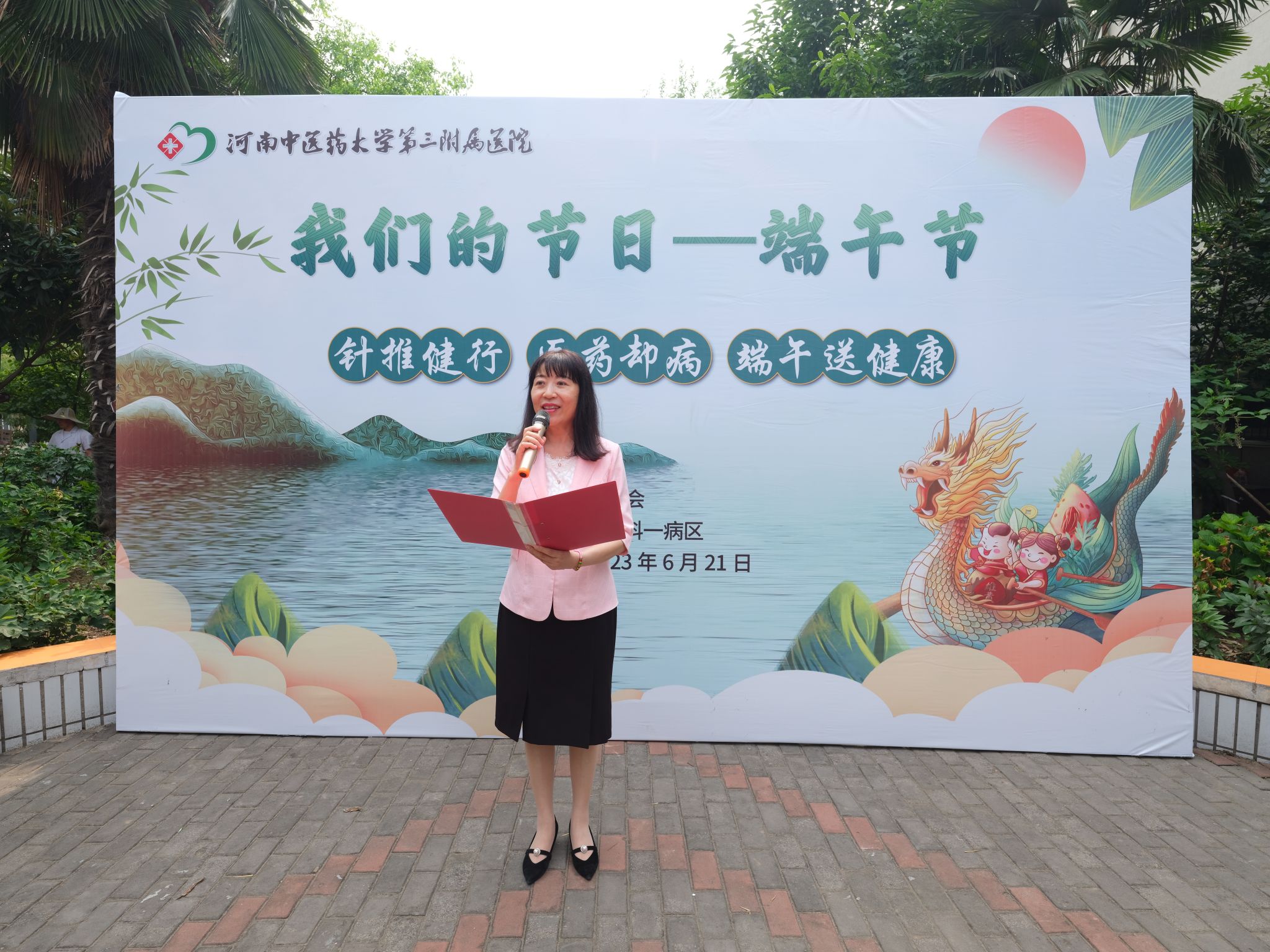活动伊始,张婉红向长期以来支持中医药、关心中医药、热爱中医药的各界朋友表示衷心的感谢和热烈的欢迎。她表示,一附院高度重视中医药文化,不断拓展丰富中医药文化培育的社会渠道,在推动中医药文化进社区、进学校、进乡村的同时,也积极利用时节、时令积极开展各类活动,传播中医药文化知识,普及中医药健康理念。端午节蕴含了中医药智慧,希望通过本次活动进一步促进大家了解中医药、喜爱中医药、传承中医药、传播中医药,在社会上营造良好的中医药氛围。