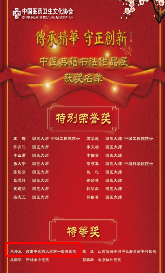 一附院李郑生教授、何英教授创作的作品在层层评比中脱颖而出并获得荣誉,有利于以书法艺术弘扬中医药文化,扩大中医药文化的影响力,普及中医药健康养生知识,充分展现了中医药文化的价值与魅力。