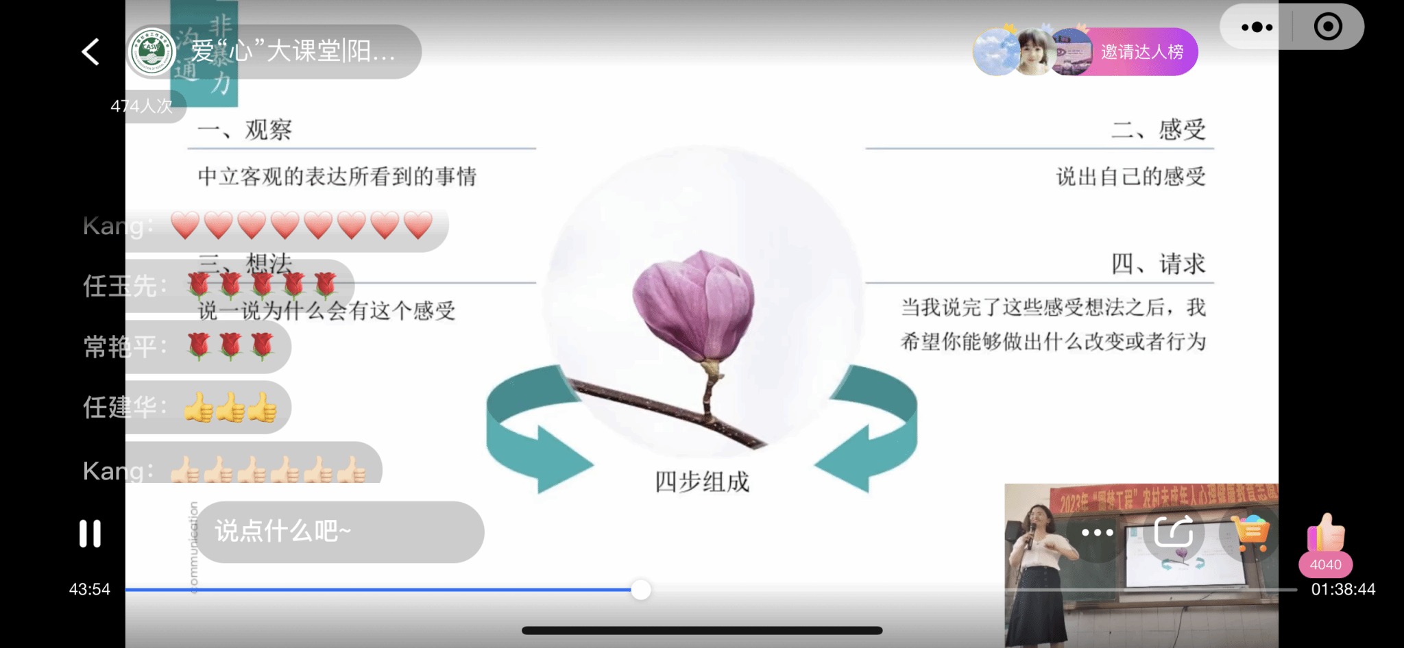 爱心大讲堂由河南工业大学范新爱副教授主讲,面向当地师生家长开展,线上同步直播。范新爱围绕“学生的心理健康及常见的心理问题”“有效的亲子沟通技巧”“家校共育培养学生积极健康心理”三个方面进行讲授,既有知识传授、方法指导,又有案例分享,内容浅显易懂,具有很强的实用性,学生、家长、老师积极参与,并进行了深入交流。
