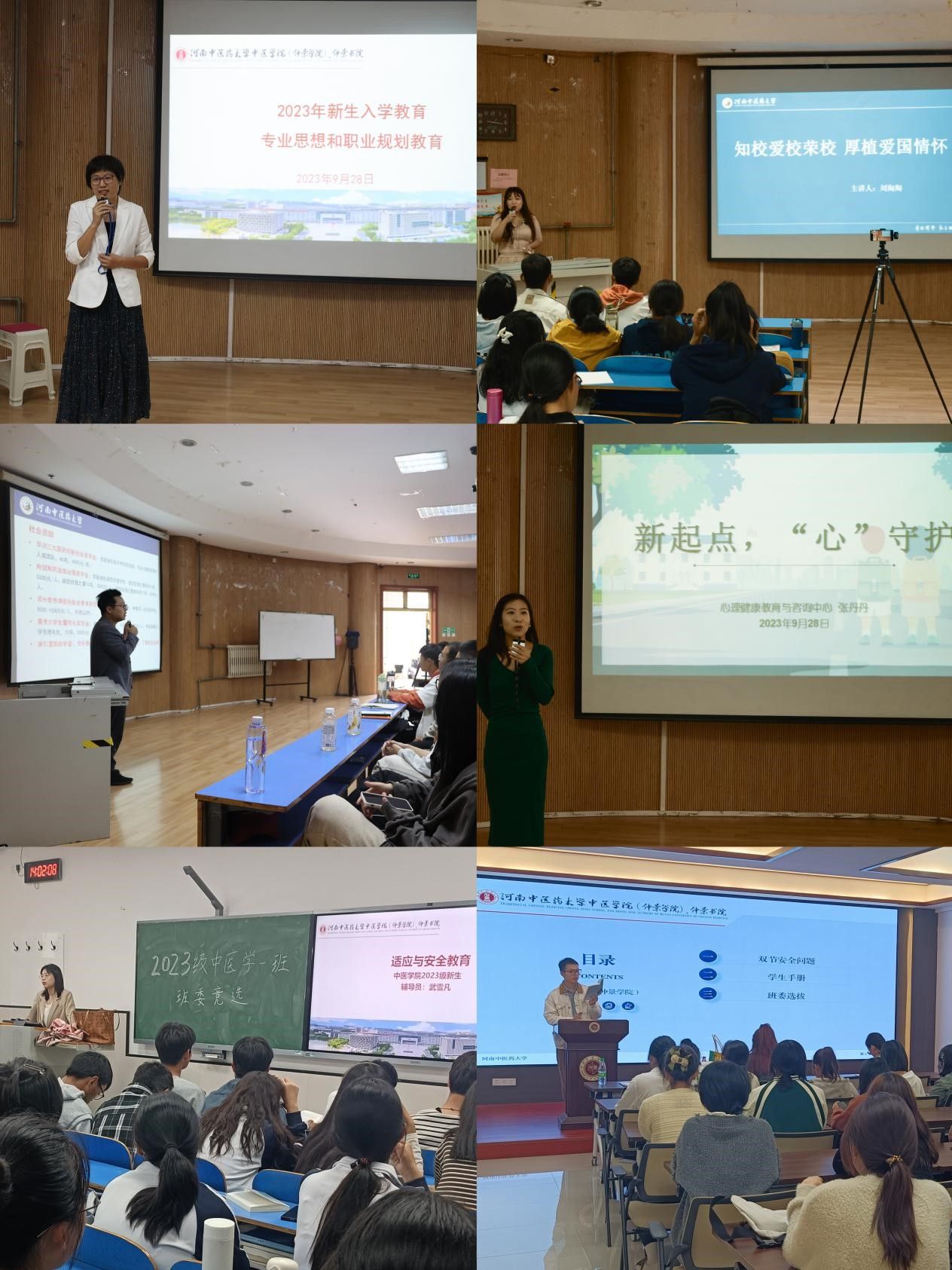 本网讯(文/武雪凡 图/杨云鹤)为帮助新生尽快熟悉校情院情、转变身份、适应大学生活、明确学习目标,中医学院(仲景学院)、仲景书院于9月27日至28日为2023级新生开展线上线下相结合的集中入学教育。学校心理健康中心张丹丹、学院教学办主任徐会敏、学工办副主任刘淘淘、分团委副书记吴明明以及新生辅导员武雪凡、段智丹分别为学生进行专题教育。