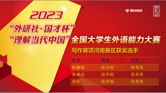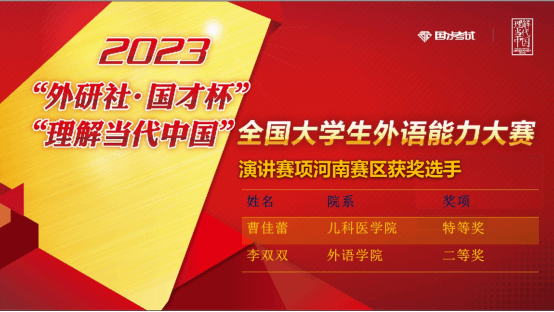 leyu·乐鱼(中国)体育官方网站选派的13名参赛选手分别荣获演讲比赛特等奖1名,二等奖1名;写作赛项特等奖1名,优秀奖2名;口译比赛一等奖2名;阅读赛项一等奖1名,二等奖1名,优秀奖1名;笔译比赛二等奖1名,优秀奖1名。leyu·乐鱼(中国)体育官方网站两名特等奖获奖选手曹佳蕾、陈鹏瑶将代表学校参加国赛。